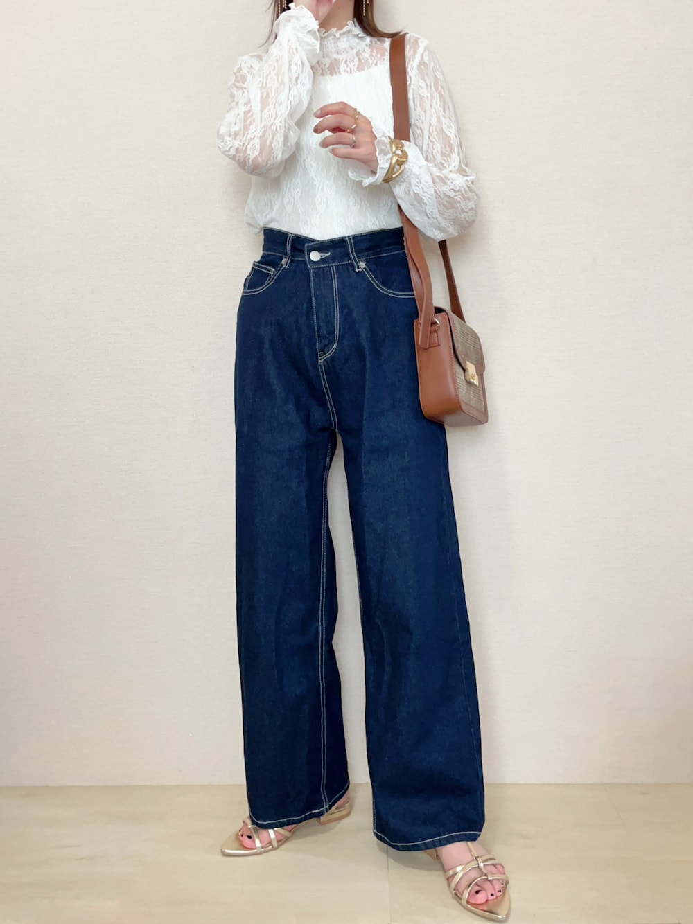 【 シアーレーストップス】 プチハイネック襟がかわいい シアーのレーストップス。 伸縮性もあって着やすい。 今回はシンプルにデニムと合わせました。 秋冬はスウェットやニットのインナーにしても 絶対かわいいやつ♡ 1枚持ってると超絶便利なアイテムです。 私はホワイト、M着用です。 ぜひチェックしてみてください♡