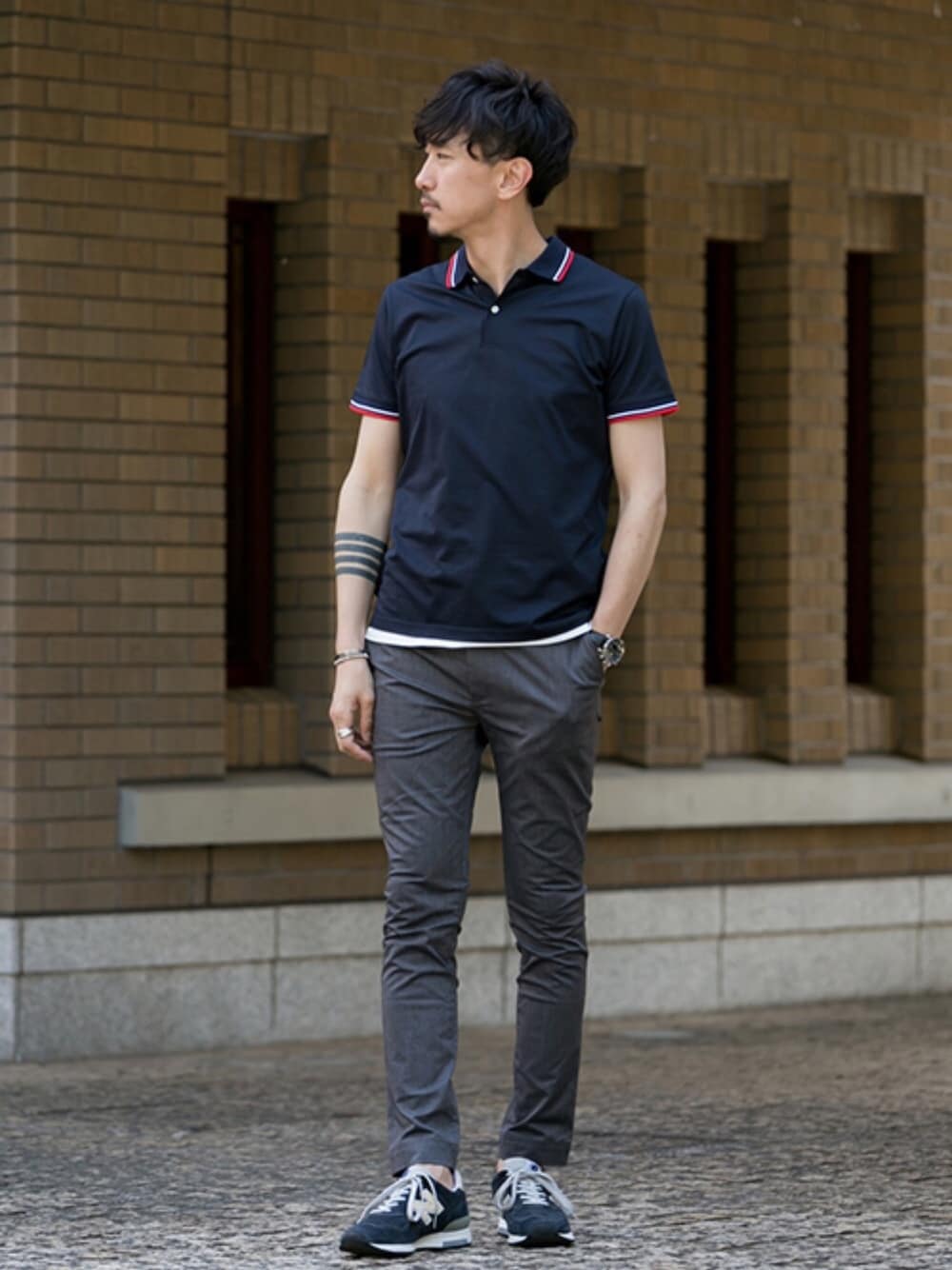 学生っぽく、またはオジサンっぽくなりがちなポロシャツには、ツヤ感のあるグレーのパンツがグッドチョイス◎ 濃い色でまとめる事で、過度なスポーティー感も和らぎ、キレイ目にも見せられます。 細身のパンツには、ボリュームスニーカーでシルエットに変化をつけるのがオススメです。