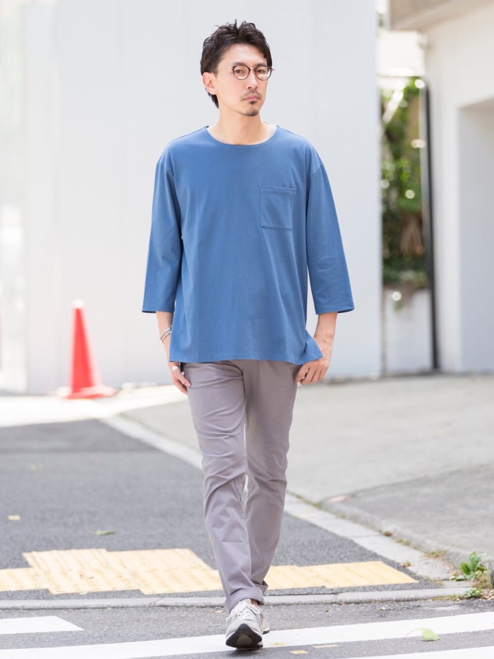 柔らかな素材を活かしたバスクシャツは、わざとサイズアップして、今っぽい抜け感を出して。 ブルーと相性の良いグレーのパンツで、きっちり感を少々乗せております◎ フレームの細い眼鏡も上品なイメージを助長してくれます。