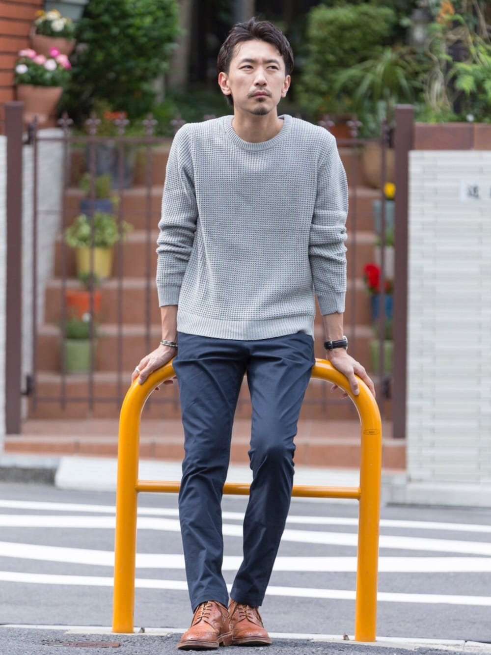 柔らかな風合いのコットンニットは、ウール素材では選びにくい「グレー」がオススメ。 鉄板相性のネイビーのパンツを合わせ、赤茶のブーツを合わせれば、差し色とボリューム効果で全体的なメリハリが加わります◎