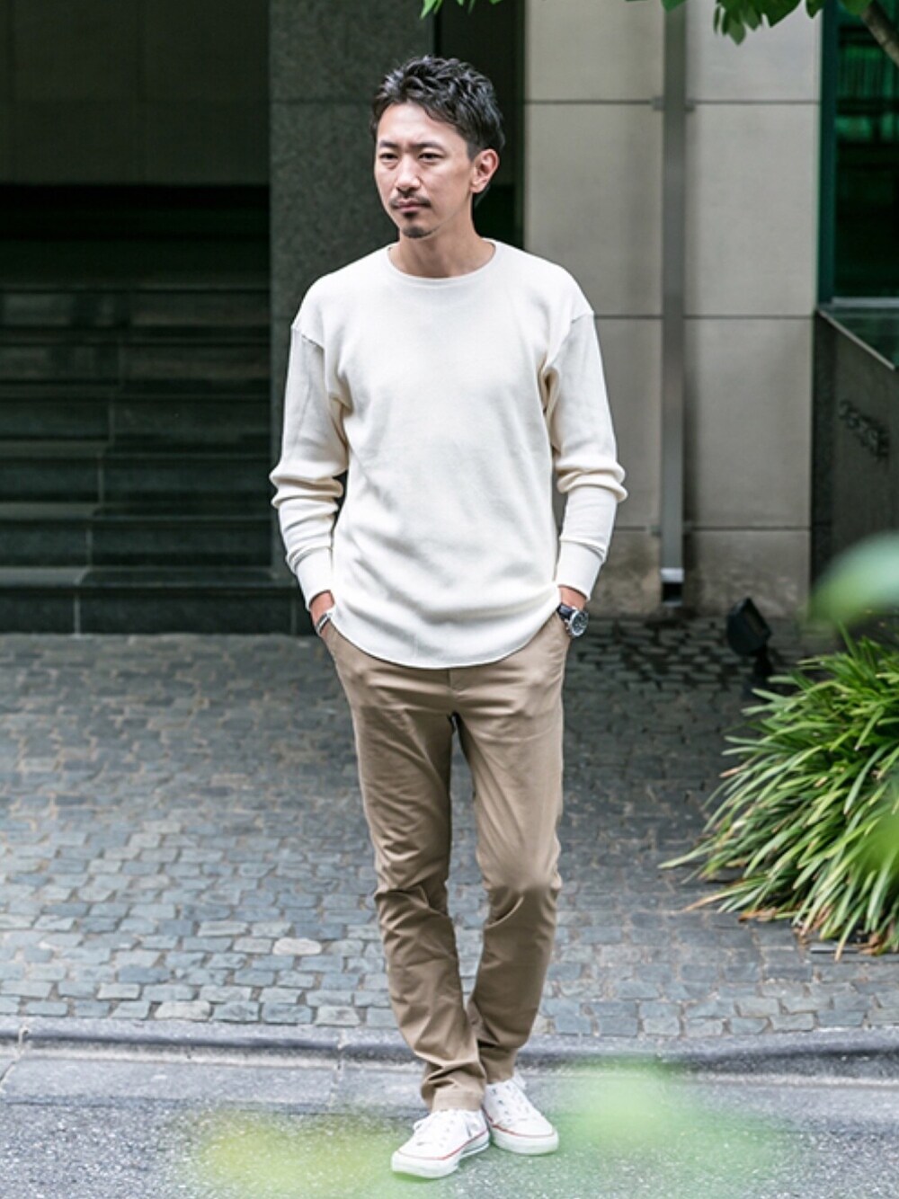 オートミール、ベージュ、ホワイトと、似寄りのカラーのみですっきりまとめたコーディネートです。 全体的に淡くメリハリが弱いので、腕まくりや裾のクッションで、意図的な「たわみ」を加えるのがポイントです。 柄モノのストールを足しても良いですね☺︎