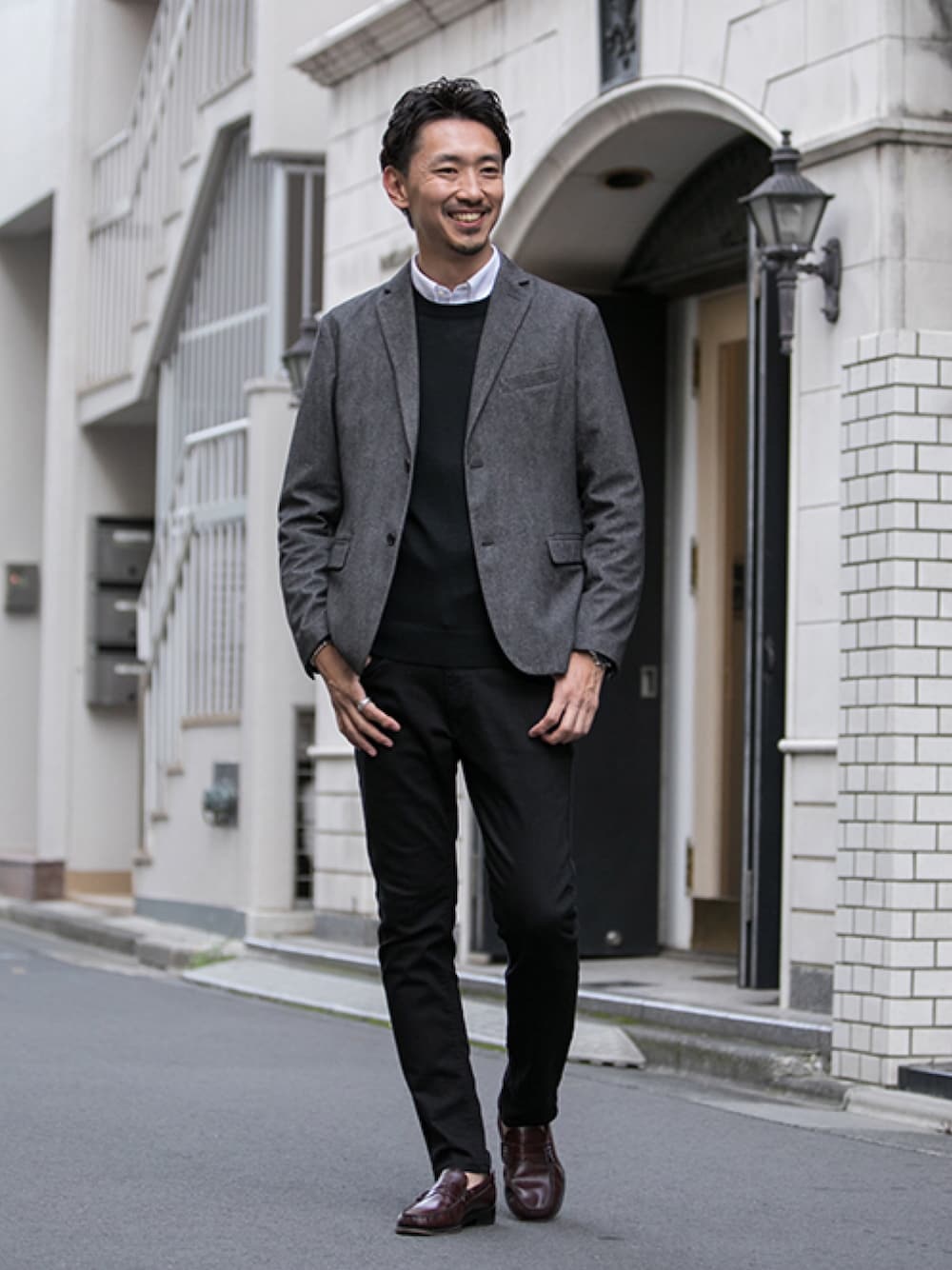 白シャツ、ハイゲージのクルーニット、ローファーときれい目揃いのアイテムを、ブラックデニムでカジュアルダウンさせています。 一見薄そうなテーラードジャケットですが、軽量でウールさながらの保温性を持ち、動きやすく収納力もある東レの新素材のおかげで、見た目よりも暖かです◎