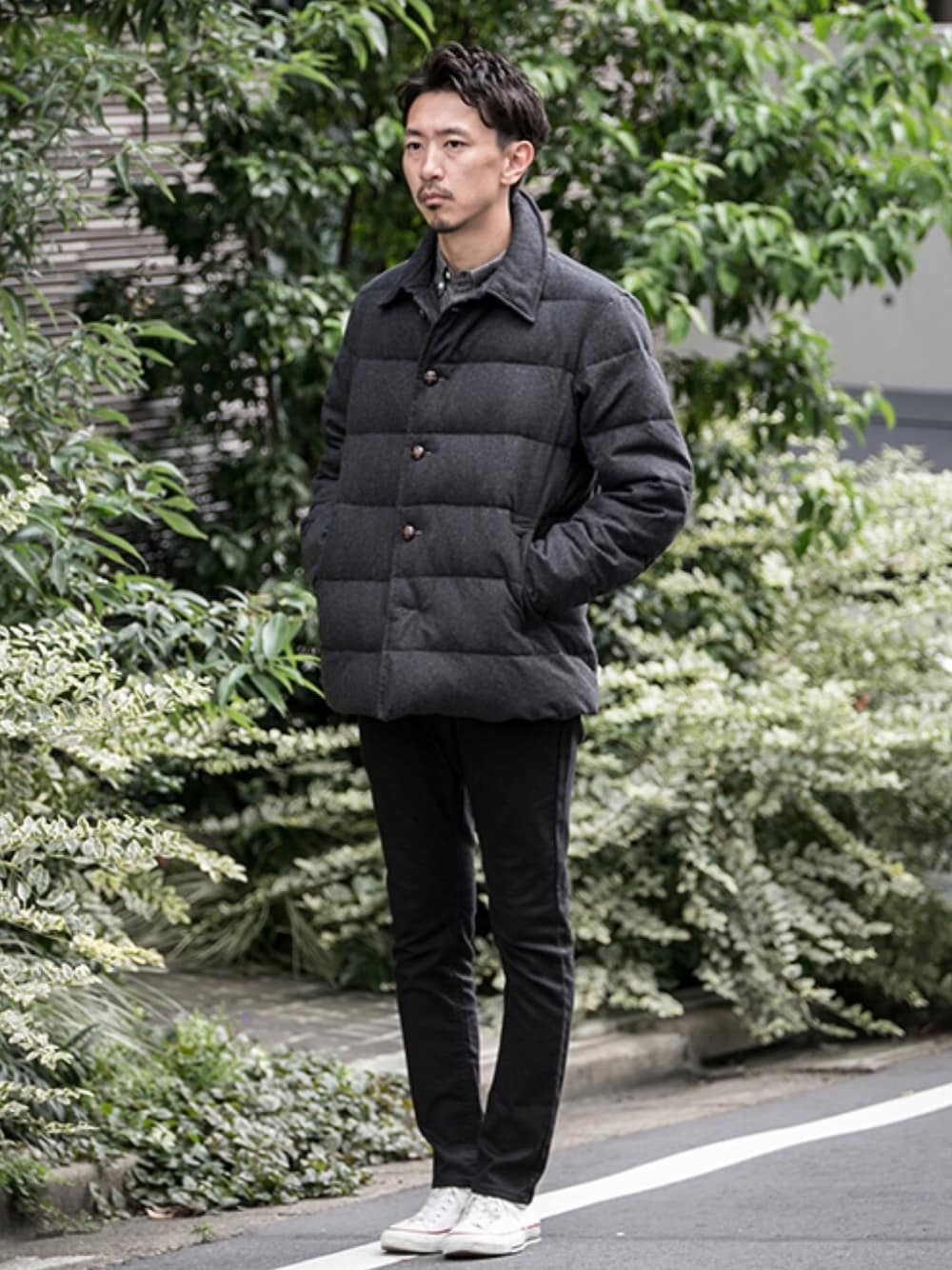 究極のミニマルスタイルです。 白黒グレーのグラデーションカラーのみで構成し、前も閉じる事でシンプルを極めました。 ボリューム感のあるアウターには、細身のパンツが基本ですね◎