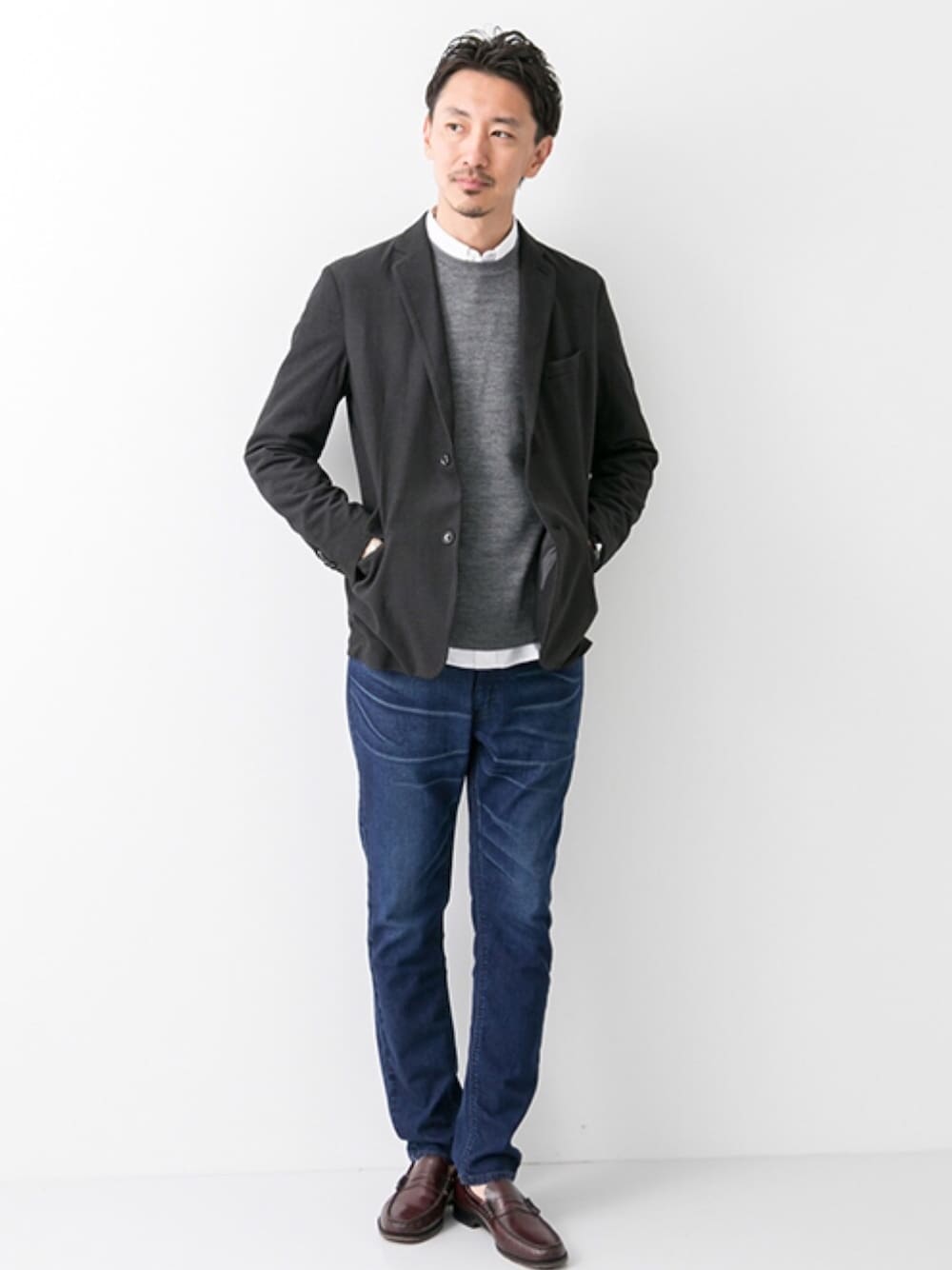 ビジネスカジュアルのスタイルにも対応可能な、程良くきっちり感のあるコーディネートです。 自宅で洗えるニットとジャケットを合わせ、ヘビーローテションにも耐えられる組み合わせ。 デニムをノンウォッシュかワンウォッシュにするだけで、グッと印象も変わります。