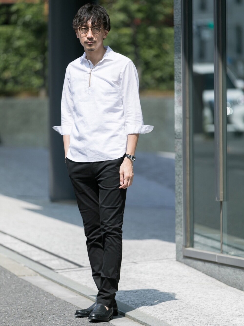 リラックス感のあるスキッパータイプのプルオーバーシャツを主役に。 オープンカラーのシャツが流行っているので、このデザインもなんだか今っぽく仕上がりますね。 ややフォーマルに合わせるとしたら、ラインも色味もこれぐらいスッキリが◎