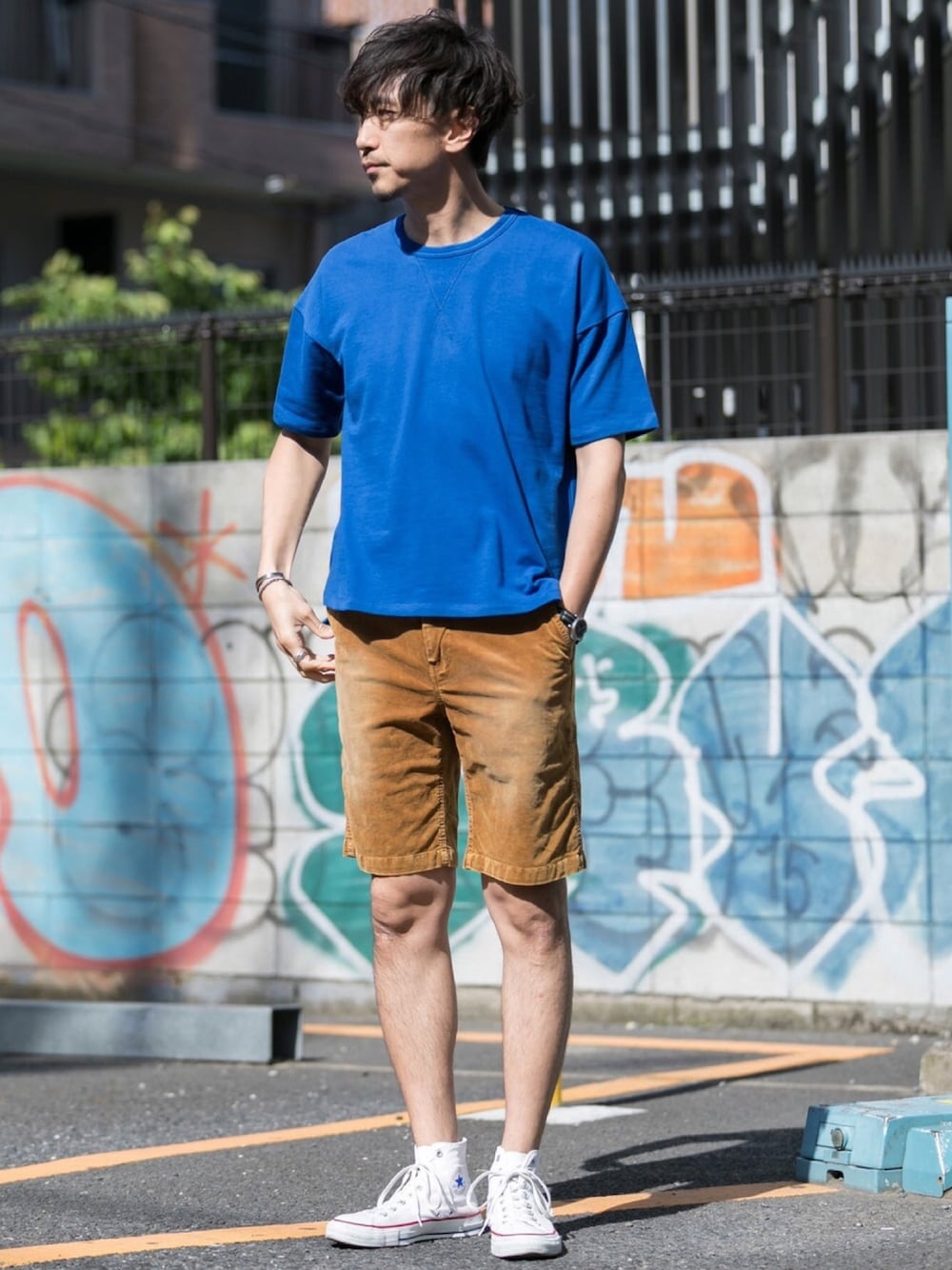 鮮やかなビビッドカラーの薄手スウェットに、スモーキーカラーの渋めコーデュロイショーツで、メリハリをつけました。 カラーリングが最高に好きです◎ ハイカットスニーカーだと、ローカットよりも締まりますね。