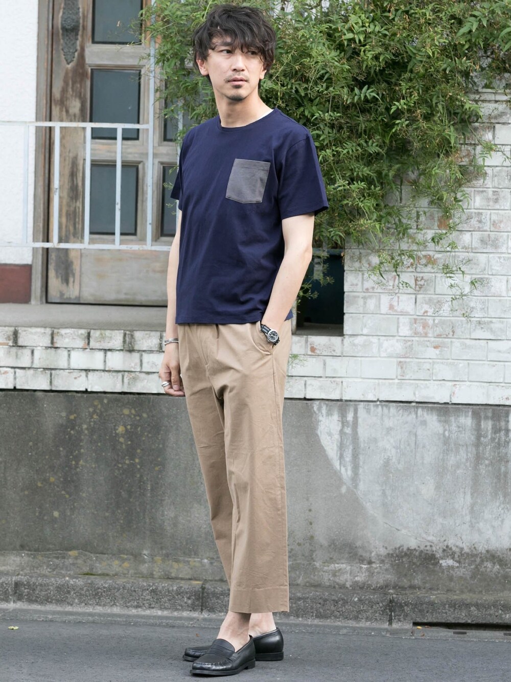 ポケTeeにワイドチノパンツというラフな感じ。 色味を抑えてローファーを合わせるだけで、ちょっとだけ洗練された感じに◎
