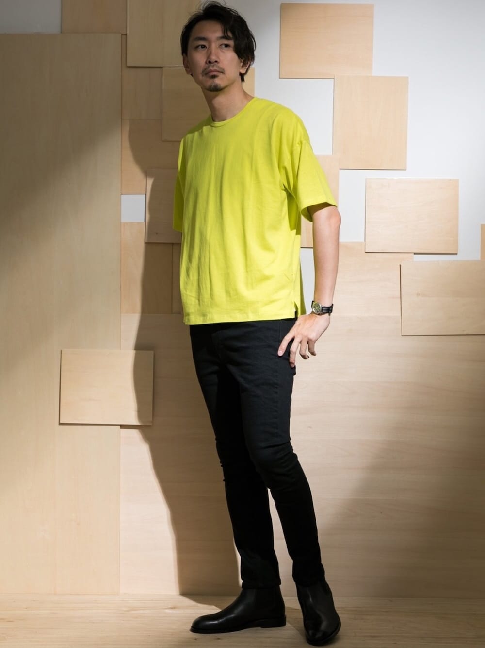 色とシルエットでメリハリを。 蛍光カラーは最近人気のアイテムですね。 ゆったりトップスにスキニーデニムを合わせて、サイドゴアブーツを合わせ、ネオパンクなイメージで◎