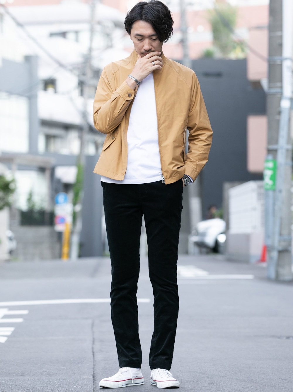 ベージュのスイングトップは、おじさんぽくならないように、細身のパンツで仕上げるのが簡単です◎ 白を多用してクリーンさも。