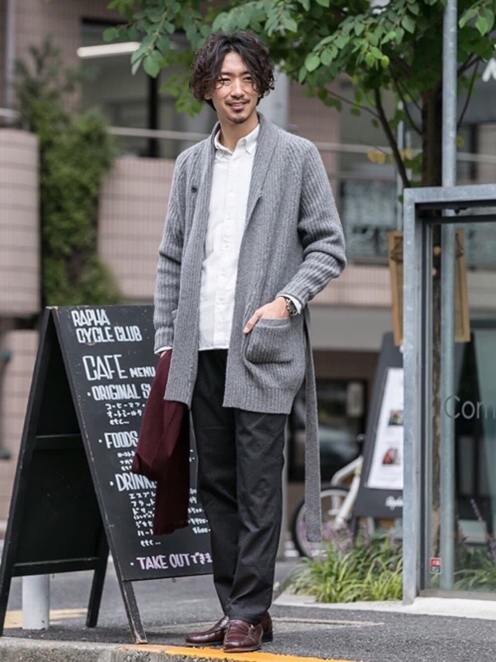 白グレーのグラデーションコーディネートで、品のある大人のカジュアルさを出しました。 ローファーとストールをワインレッドで統一したのがポイントです。 モノトーン系のカラーコーディネートと相性抜群◎