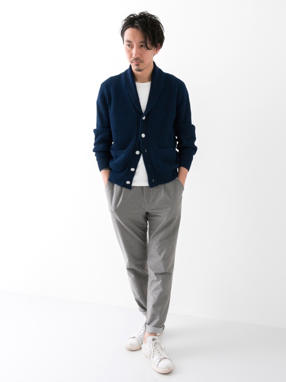 インディゴ染めしたあぜ編みのニットは、コンチョボタンがポイントです。 ボタンの仕様によりネイティヴ感や民族感が出るので、グレーのスラックスで品良くまとめるのがポイントです◎