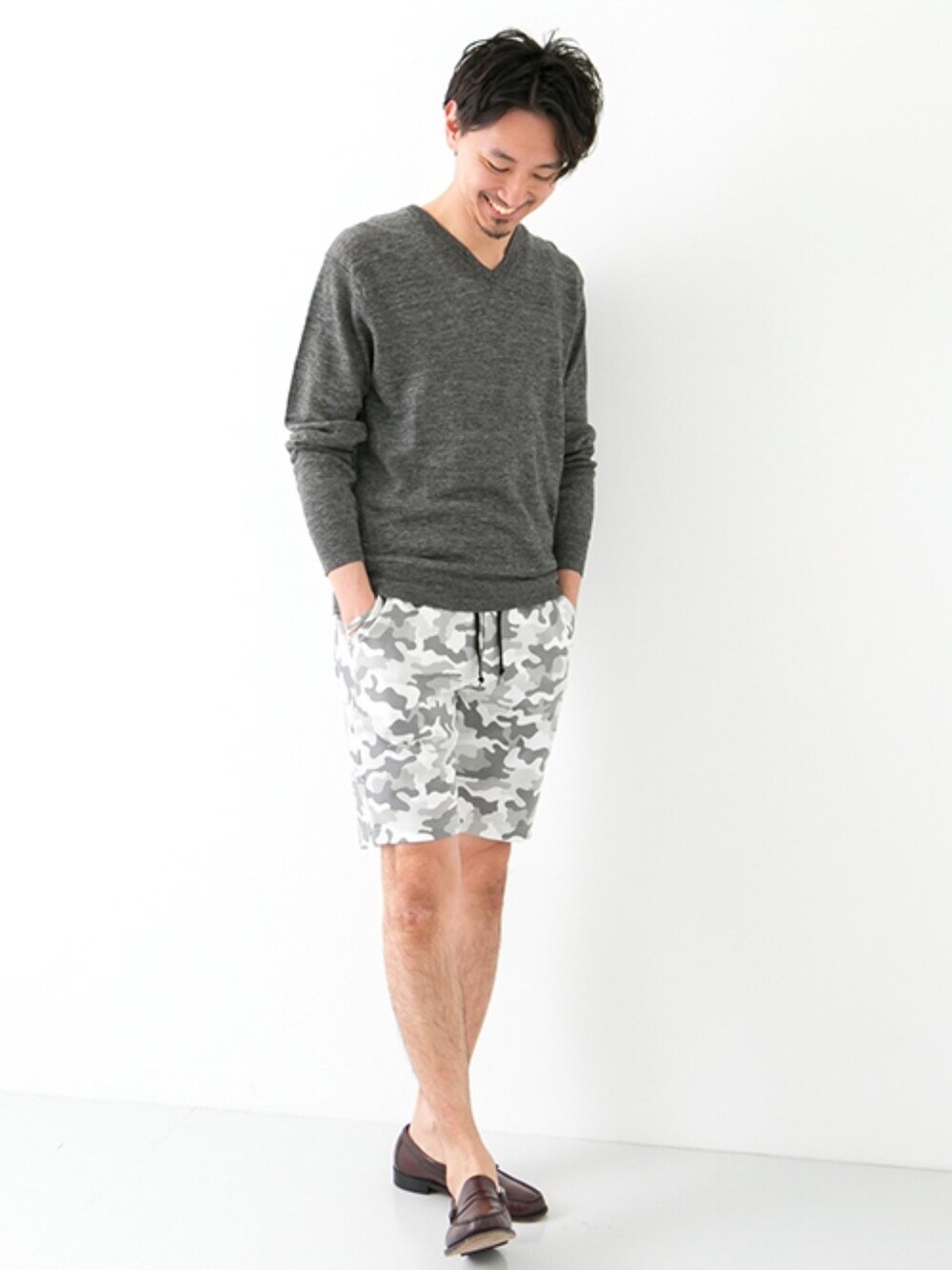 大人の男の初夏スタイルは、長袖トップス×ショートパンツが断然オススメ◎ 色のトーンを落としつつ、革靴と合わせながらも、迷彩柄で遊びをプラス。 浅めのVネックなら、どなたでも似合いますよ☺︎