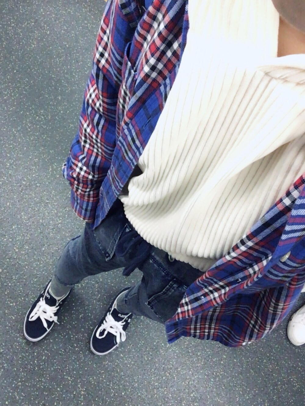 白パーカーに 青のチェックシャツが映える!