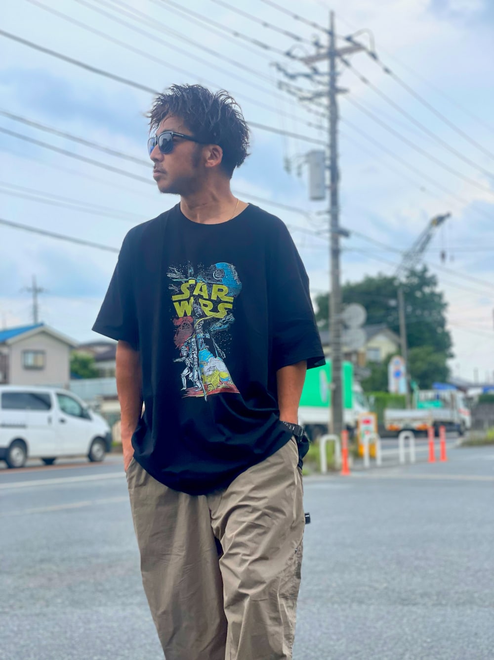 古着のようなTシャツが欲しくて見つけたスターウォーズTシャツ。古着だとサイズが合わず、ネットで購入。3XL。パンツは、BROCHUREのphotographer白川モデル。履きやすい生地とポケットの数が魅力的。