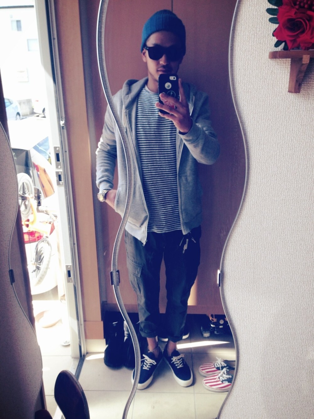 連休初日☻ ようやく春本番… ニットキャップ スタンダードカリフォルニア パーカー H&M ボーダーカットソー ロンハーマン カーゴパンツ UNIQRO スニーカー VANS