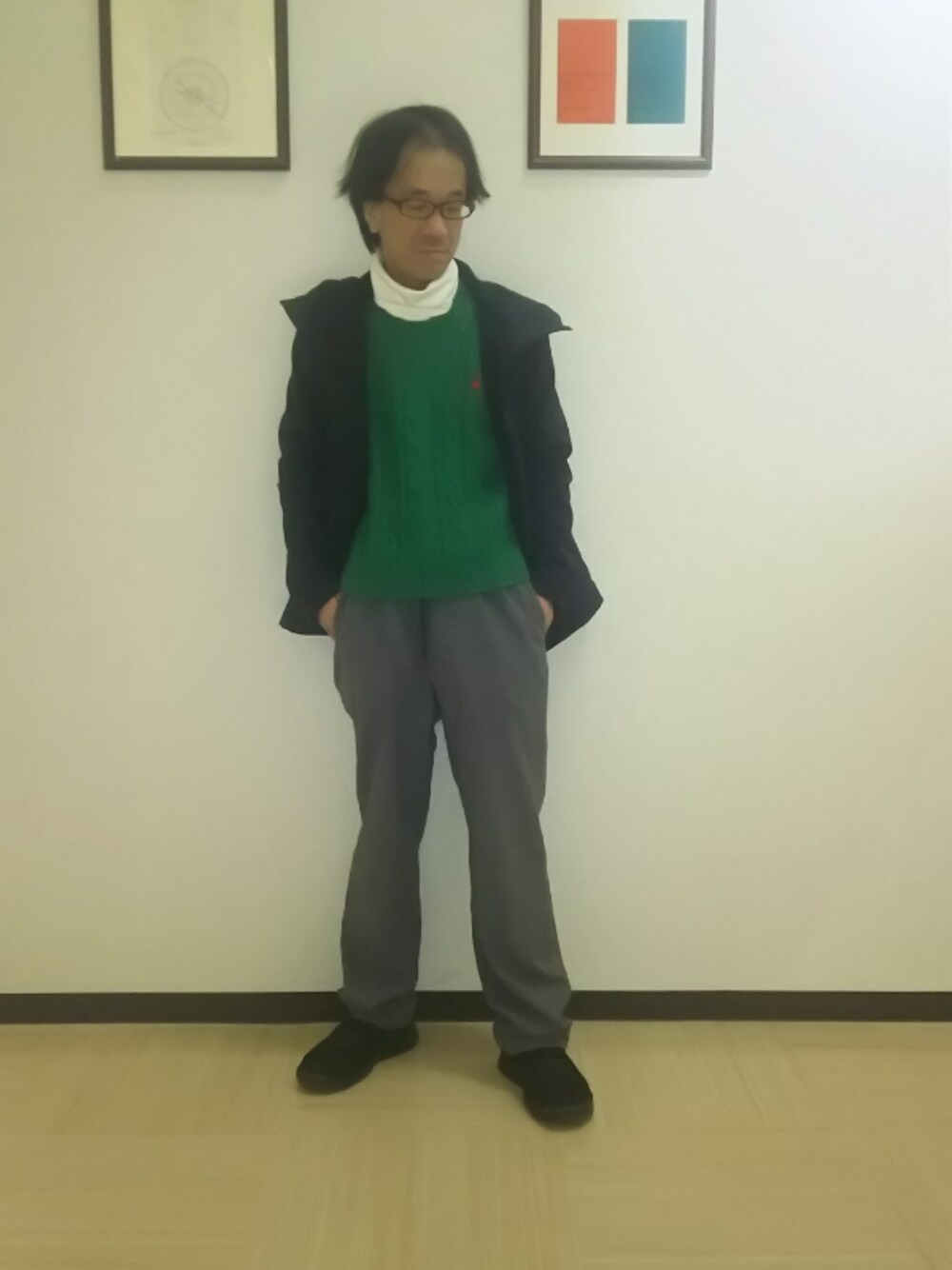 着用しているグリーンのBENETTONはレディースのサイズです。