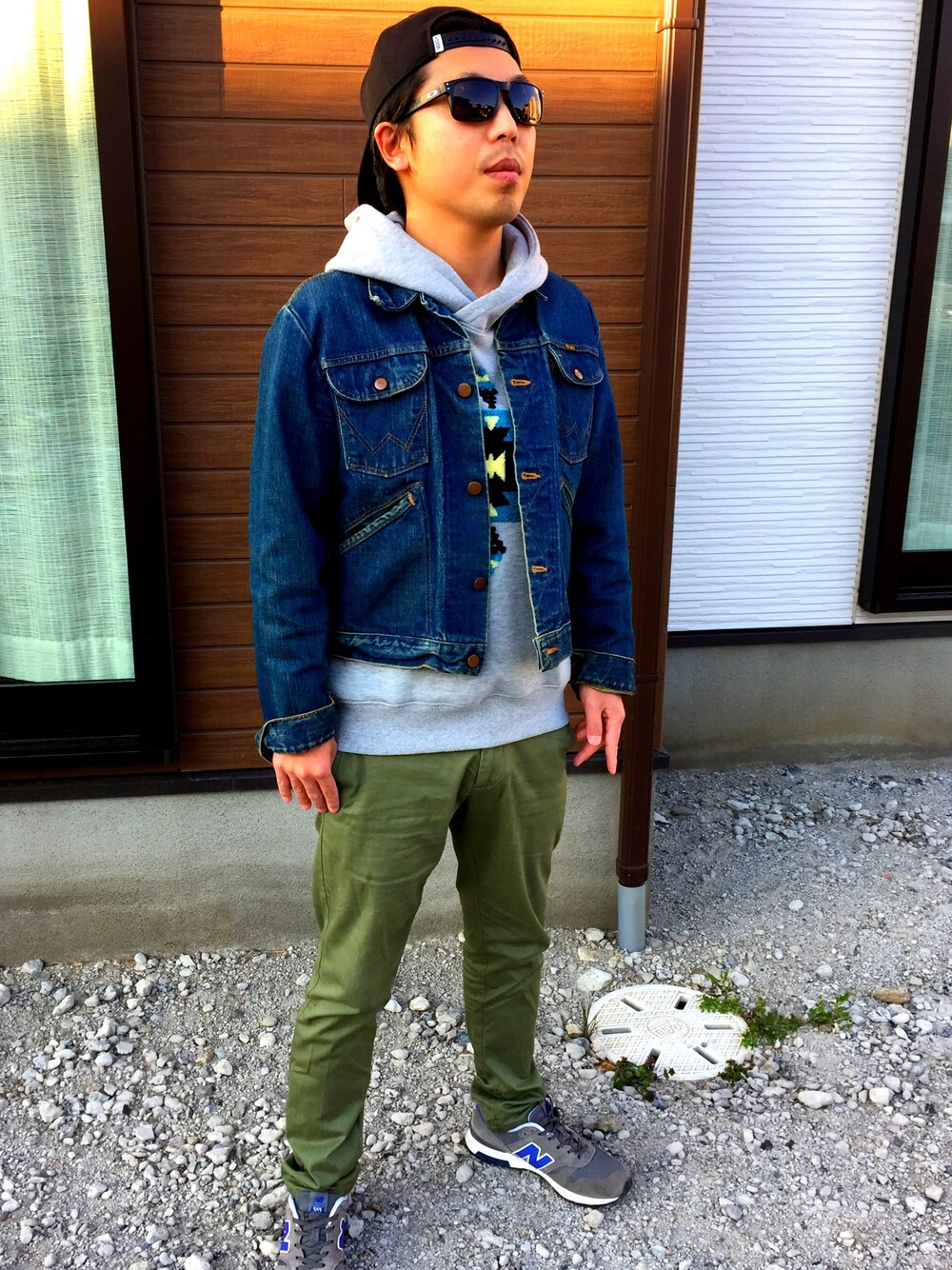 ラングラーのヴィンテージデニムジャケットを メインにオルテガ柄のパーカーを着て、春先っぽいコーデにしてみました(^^)