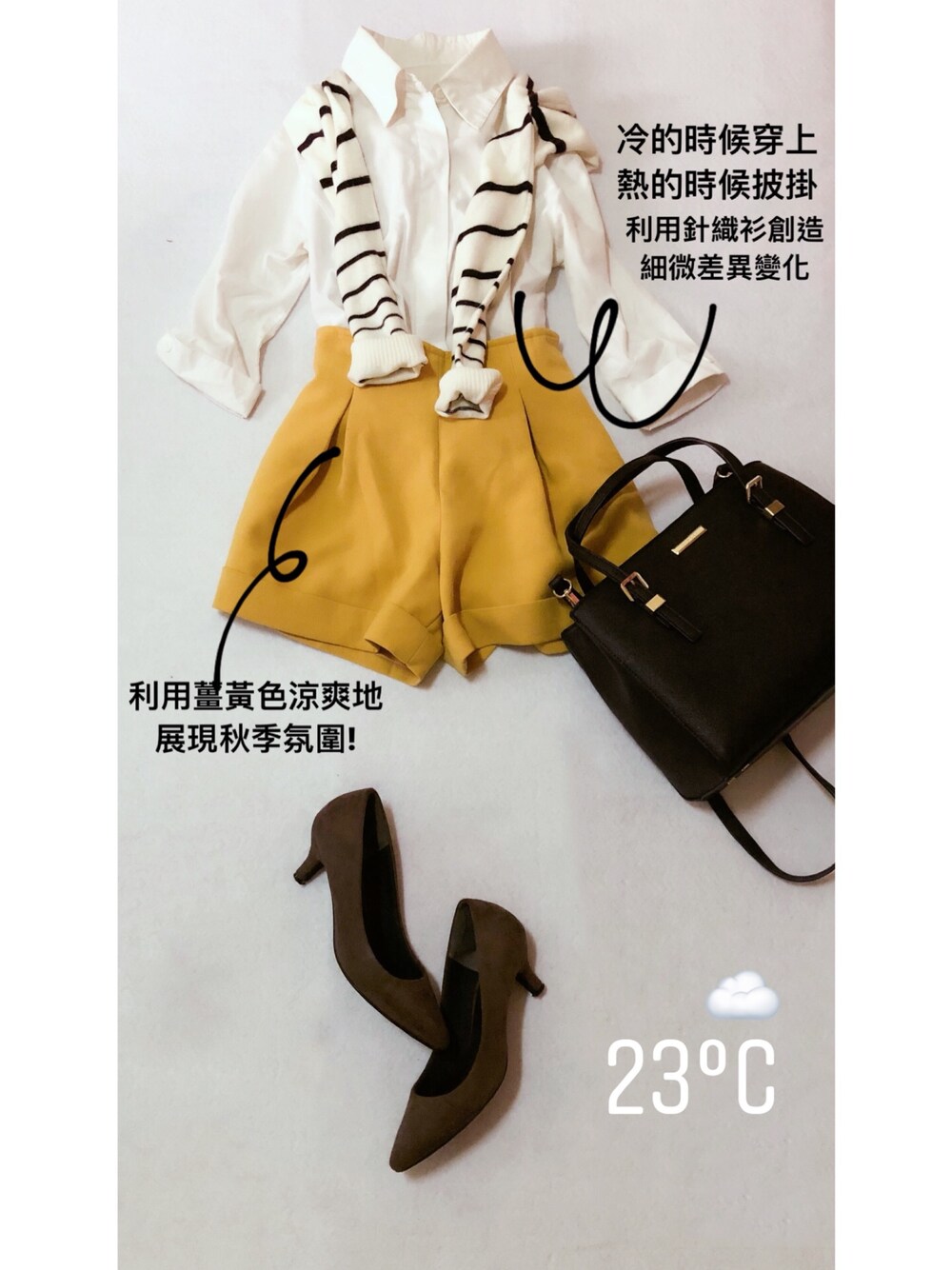基本款襯衫加上秋季色薑黃色,涼爽地展現秋季氛圍🍁 針織衫冷的時候穿上,熱的時候披掛在肩上,既方便又能展現時尚感,是秋冬穿搭的小技巧!