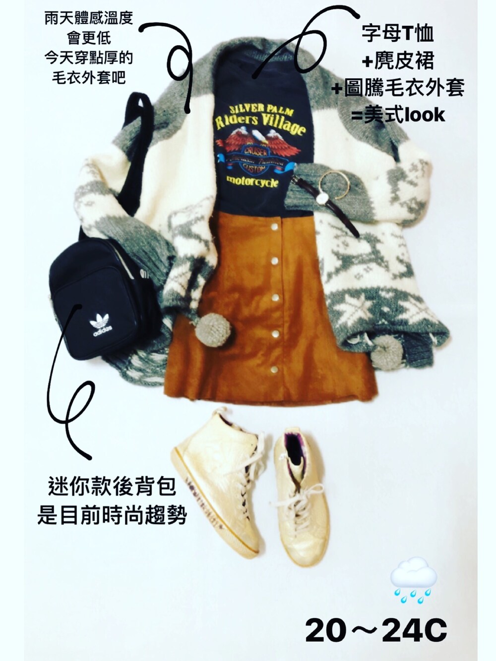 10月28日 雨 20~24度 週六來點休閒風格 今日穿搭公式:字母T-shirt+麂皮裙+圖騰毛衣外套=美式look 大家都會有後背包會太休閒不時尚的感覺,現在只要挑選迷你款、皮革、絲絨或毛呢材質,就很時尚喔! 昨日小編逛GU,有看到絲絨材質後背包覺得不錯喔!