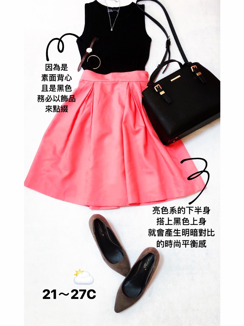 11月1日。天氣時陰時晴。21~27度,好熱 今日穿搭公式:亮色系下身單品*上身黑色單品 創造明暗對比的時尚平衡 因爲上身爲素色,且是黑色,務必以飾品來點綴! 若覺得冷可搭配牛仔外套