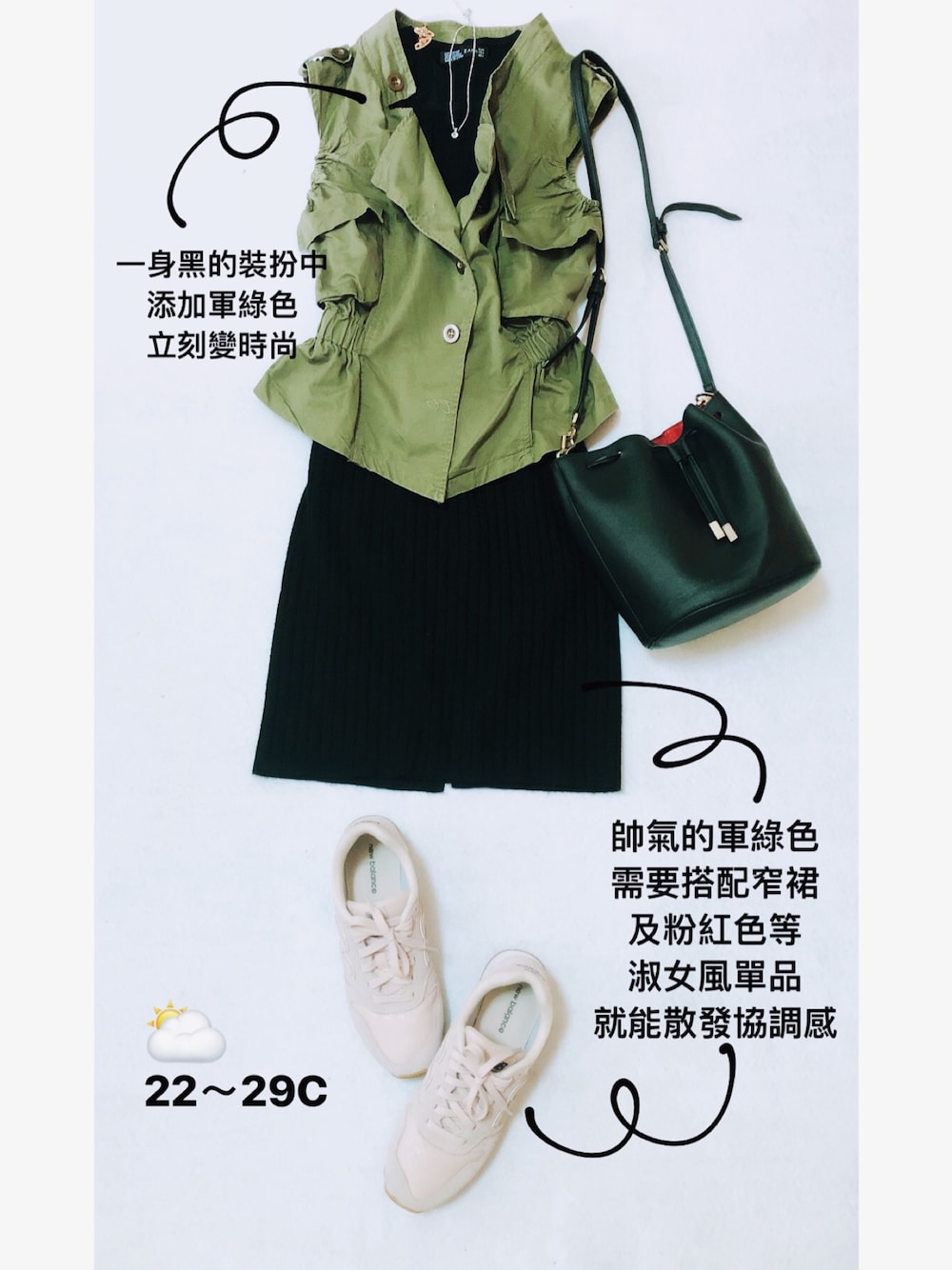 11月2日。天氣晴時多雲偶陣雨。22~29度 在一身黑的裝扮下,加上軍綠色單品,立刻變時尚! 雖然軍綠色很百搭萬用,但要注意若全身都以帥氣休閒單品做搭配則會失去時尚感,因此以窄裙及粉紅色這種淑女風單品來搭配,就能散發協調感。