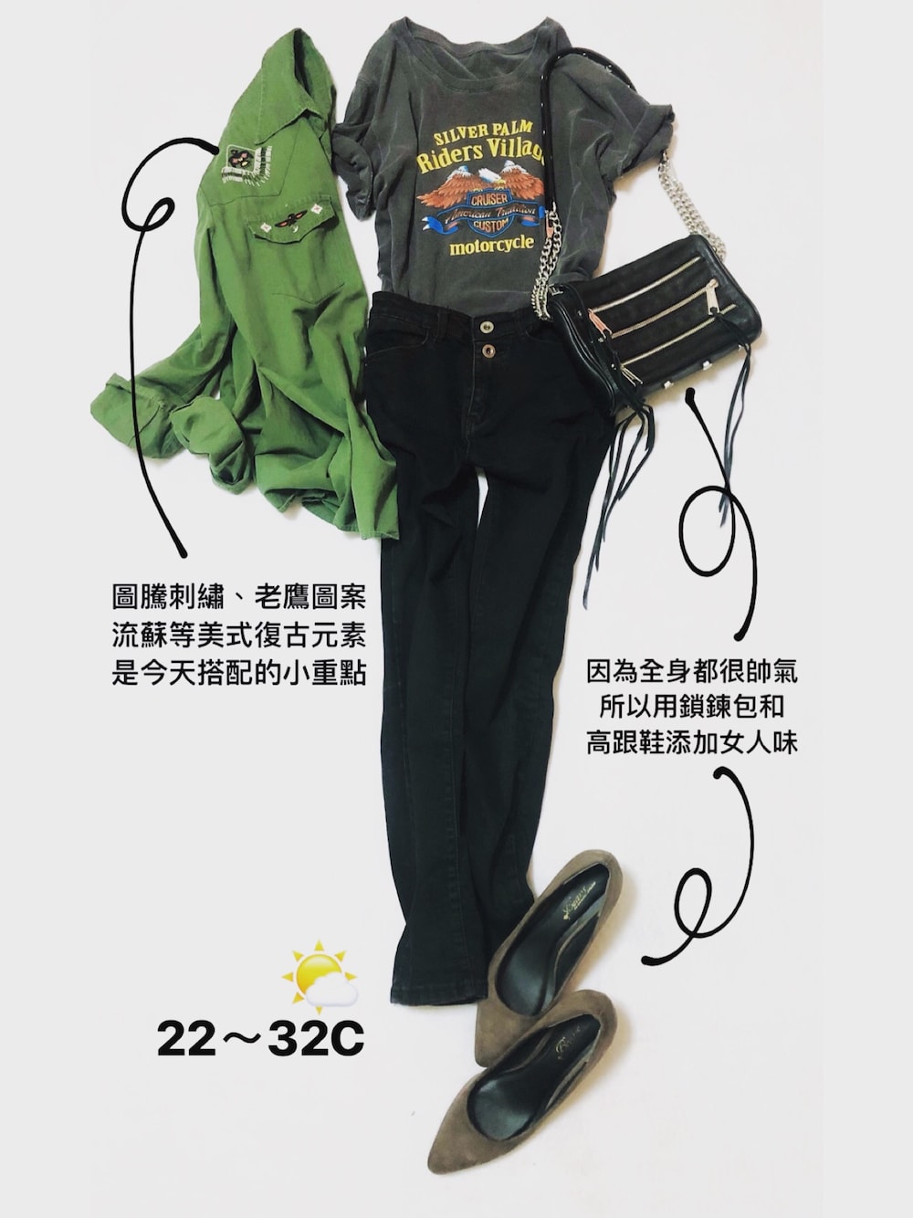 11月7日。晴時多雲。22~32度 秋老虎發威,短袖大復活 不過還是要聽天氣小姐說的話 早出晚歸帶件外套 今天想來點帥氣的樣子 選了有圖騰刺繡的軍綠色襯衫當外套 與老鷹字母T-shirt很搭,帥氣up! 不過最後還是要利用鎖鍊包和高跟鞋 加點女人味 帥氣與女人味就像佳餚的Bliss point 鹹與甜要恰到好處才美味 妳找到妳人生的Bliss point了嗎?