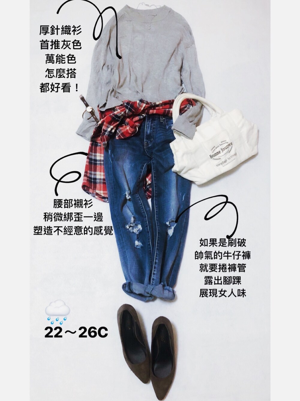 11月8日。雨。22~26度 今日穿搭公式:灰色厚針織衫*藍色丹寧*紅色格子襯衫 厚針織衫界的第一名絕對是灰色無誤 搭上格子襯衫綁得歪歪的 營造不經意的感覺 最近入手一件NET的牛仔褲只要899元 因為我大腿有點粗 試穿了Zara,uniqlo,H&M GU, 都沒有這件顯瘦!貼身但不緊蹦 不會像大腸腿 同事也買了一件! 推薦大家去net試穿喔!