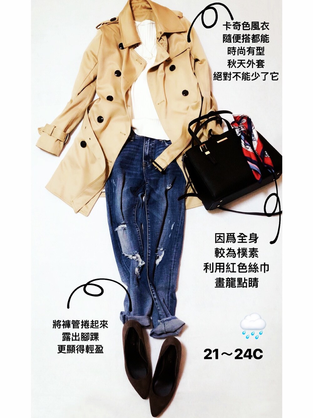 11月13日。雨。21~24度 今天穿搭公式:卡奇色風衣+白色薄針織+牛仔褲 是基本款+基本款+基本款=懶人零失誤穿搭 卡奇風衣簡直是隨便穿隨便好看! 但絕對要堅守購買基本款 不要被有皺折、圓領、荷葉邊等畫蛇添足的裝飾吸引 材質上也要挑選硬挺不易皺的布料 另外肩膀上的裝飾也要注意 有些裝飾太長突出自己的肩膀 會顯得奇怪! 長度的話,越長版越顯得時尚 但膝蓋上5~10公尺的長度是最百搭的