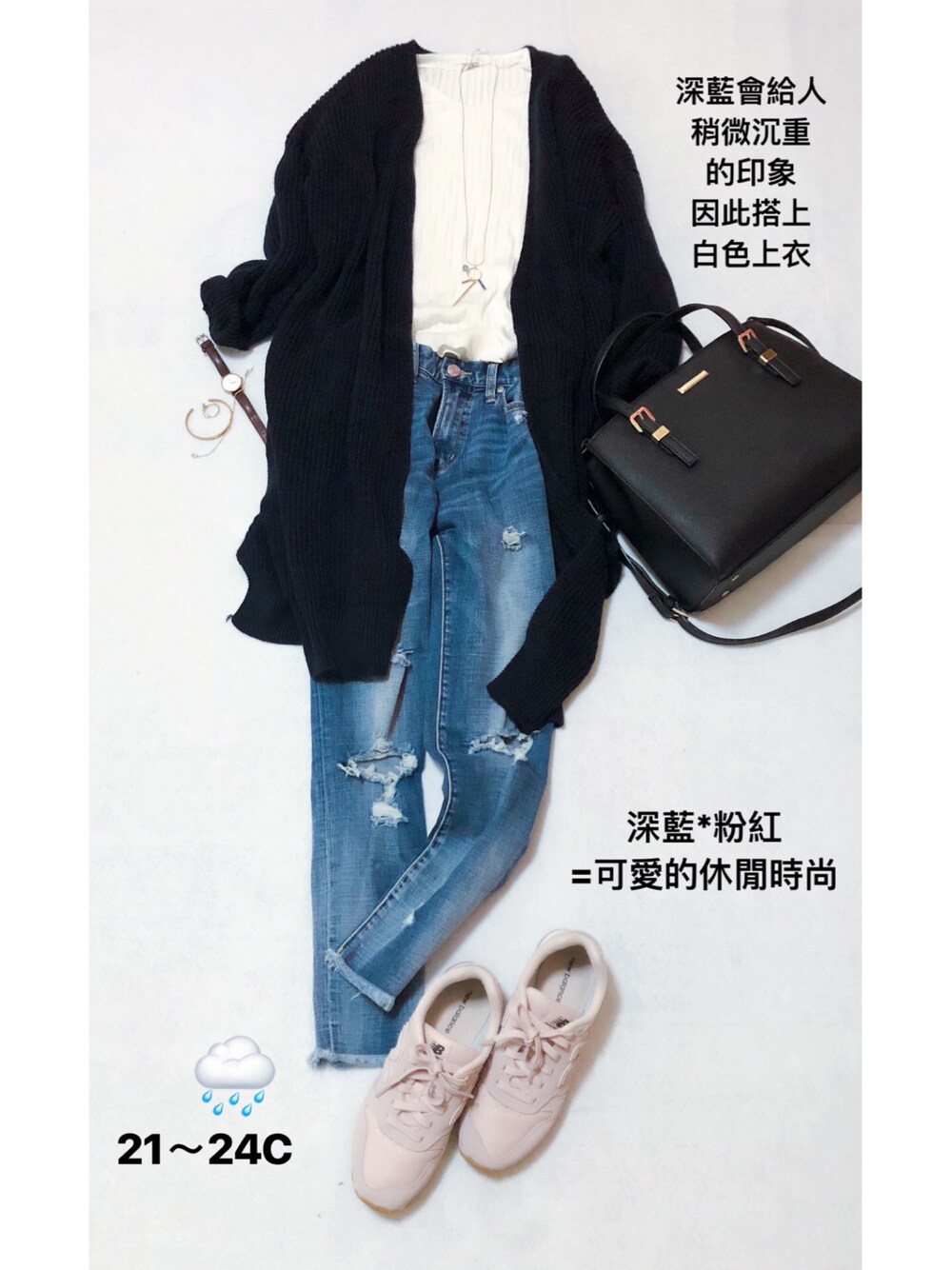 11月14日。雨。21~24度 今日穿搭公式:深藍*粉紅=可愛的休閒風格 深藍長版外套略顯沉穩和笨重,因此搭上九分褲露出腳踝來平衡。並利用白色和粉紅色提升明亮度。