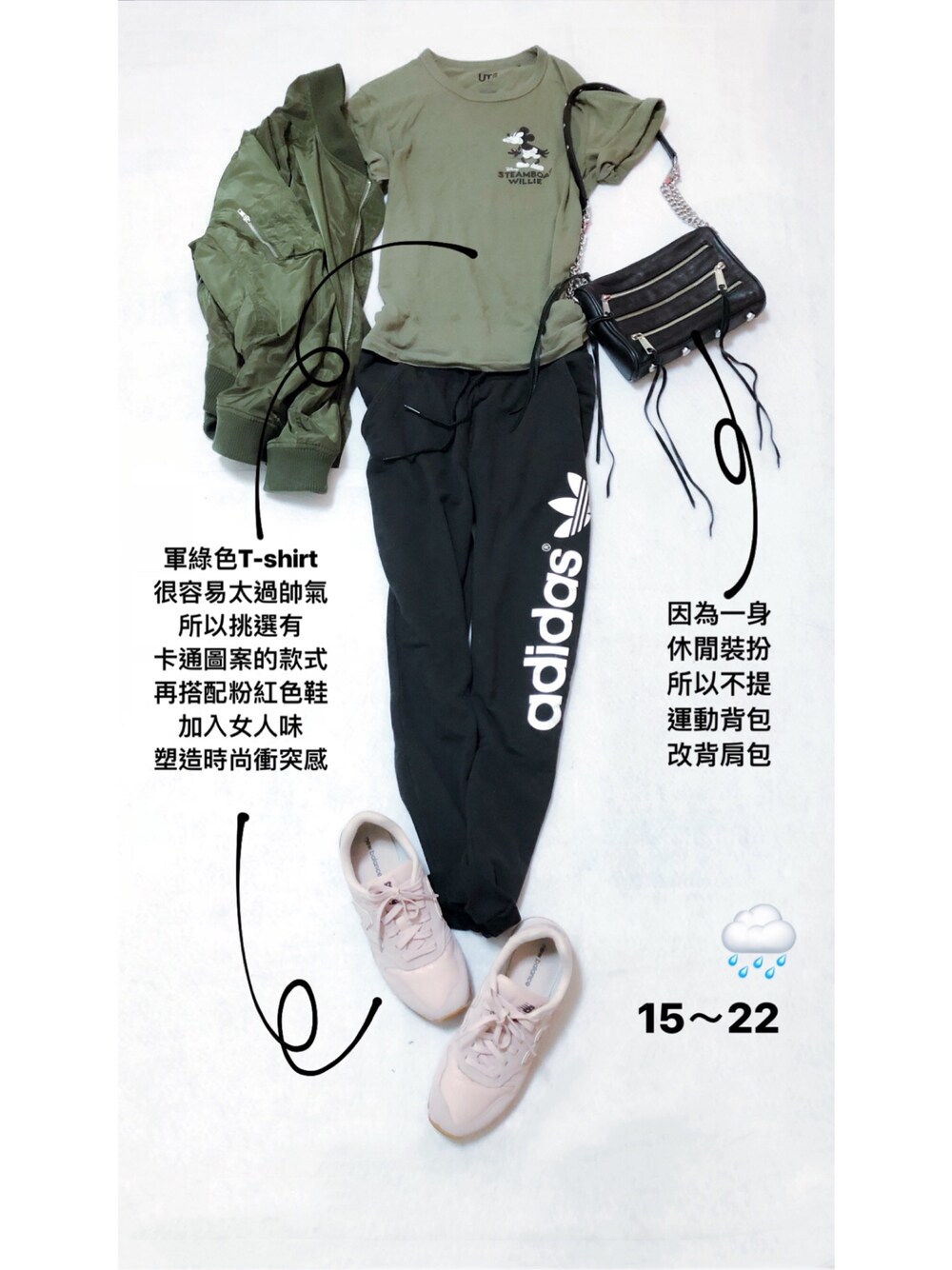 11月18日。雨。15~22度 雨天來去建身房運動吧! 軍綠色T-shirt很容易太過帥氣 所以挑選有卡通圖案的款式 再搭配粉紅色鞋加入女人味 而一身休閒服,不背運動背包 改背肩背鎖鍊包 塑造時尚衝突感!