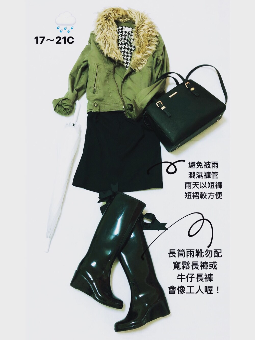 11月22日。雨。17~22度 雨天爲避免褲管被濺濕 我都喜歡穿短裙或短褲 而且搭配雨靴也較爲時尚 有次我穿了牛仔緊身長褲搭雨靴出門 經過工地赫然發現我跟工人穿得一模模一樣樣😱 後來我絕對不做長褲配雨靴的打扮了 絕對不是鄙視工人喔 只是要避免被人有奇怪的聯想啦