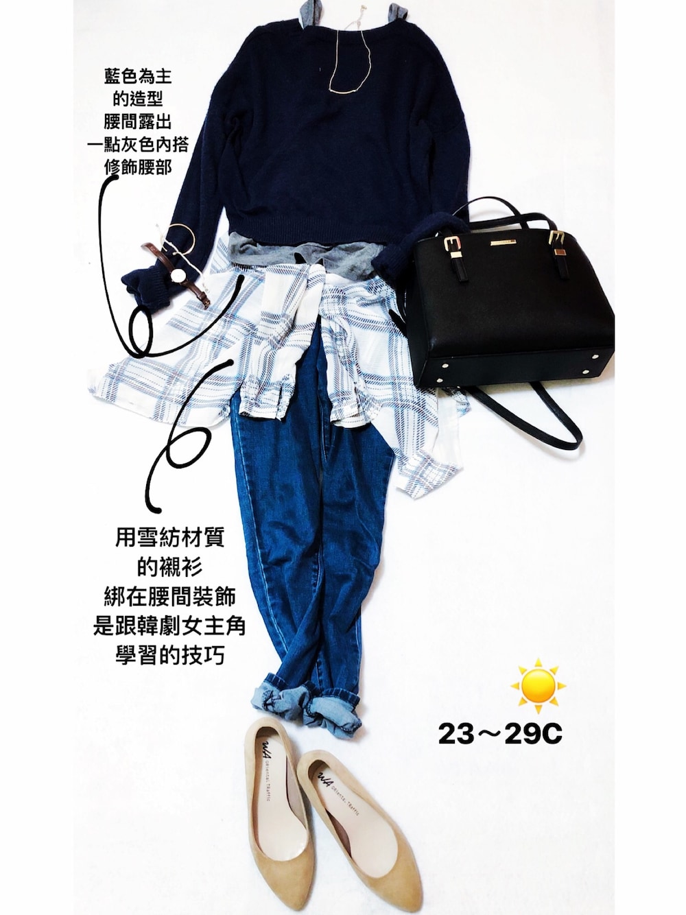 11月28日。晴。23~29度 又是一個炎熱的日子 在腰間綁了雪紡襯衫做裝飾 企圖增添點清爽感 是跟韓劇女主角學習的技巧 全身藍色系的造型 腰間再露一點灰色內搭做裝飾 營造層次感