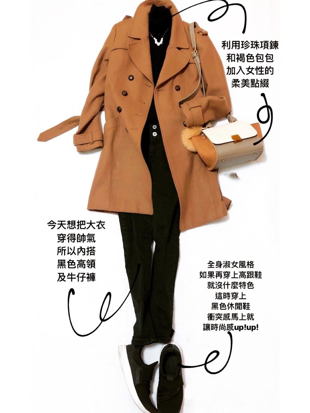 12月14日。晴。18-24度 今天想把駝色大衣穿得帥氣 所以內搭黑色高領及牛仔褲 再利用淺褐色包包及珍珠項鍊增添女人味 大衣所帶來的洗練感 這時如果再搭上高跟鞋就沒有特色 反而要用運動鞋的休閒感創造衝突的美 時尚感便up!up!
