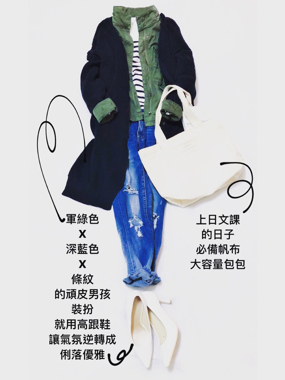 1月22日。陰。15~19度 昨晚看了新日劇unnatural 石原聰美穿了一套深藍色風衣搭軍綠色長褲,好看😍 所以今天也用軍綠色和深藍色做穿搭 這兩個顏色的搭配是經典配色 怎麼搭都好看 各位ㄧ定要學起來喔! 一身休閒的上身 最後用高跟鞋製造時尚衝突感 想像聰美飾演的女法醫ㄧ樣 自然、俐落、優雅