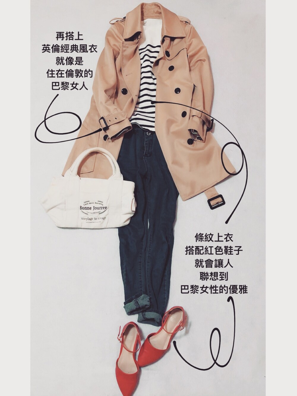 3月7日。晴。15-23度 天氣漸漸回暖,春天腳步近了 春天基本必備單品就是條紋上衣了! 今天搭的是經典法式搭配 條紋上衣+藍色牛仔褲+紅色鞋子 再搭上英倫經典風衣外套 完美偽裝成註在倫敦的巴黎女人💋