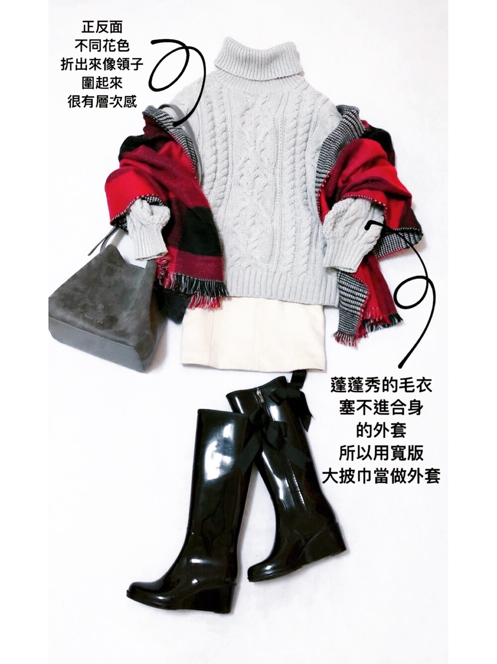 3月9日。陰。11~13度 雨綿綿的日子想著要穿雨靴 雨靴我都盡量搭配短裙或短褲 因為搭配牛仔褲或非緊身的長褲 都會讓我覺得像工人@@~ 想到下身是貼身的窄裙 上身就來個寬鬆的毛衣做對比吧! 不過蓬蓬袖塞不進合身的外套 只好用寬版大披巾當做外套 (下班時想到直接把外套披著不穿也是一種解決方式,而且又時尚) 大披巾是正反面不同圖紋 很推薦擁有一條這種圍巾 圍起來很有層次感 兩種花色更百搭 靠領口的部分反折就會像領子般 每次披著大披巾就有自己是貴婦的錯覺呢!