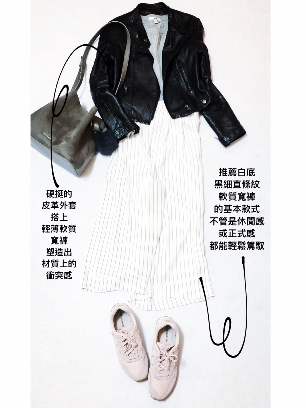 3月22日。11-18度。晴 春秋穿搭的魅力 在於冬衣搭配夏衣那種材質差異所激迸的火花 上身是冬天代表厚實的毛衣和硬挺的皮革外套 下身卻是夏天輕薄軟綿綿的寬褲 / 夏季寬褲必推白底黑細條紋的款式 直條紋長褲是上班族服飾的基本款式 因此給人嚴肅的印像 但軟質寬管褲卻又帶來女性慵懶溫柔的感覺 因此不管是要搭成休閒感或正式感都很適合 注意的是不能太過休閒 因爲會有睡褲的錯覺XD / 全身都是黑白灰 所以最後用粉紅色的休閒鞋 帶出正式vs休閒、帥氣vs可愛、黑白vs彩色 三種不同層次的時尚衝突感 #簡約時尚 #平價穿搭 #今天穿什麼 #每日穿搭小技巧