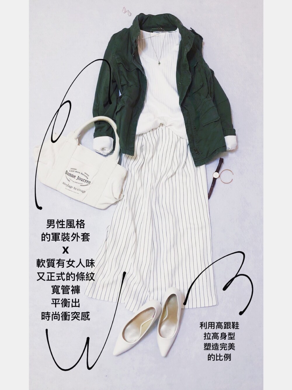 4月9日。17-28度。晴 軍綠色的立領外套 有人稱軍裝外套或工裝外套 是很百搭又時尚的單品 春秋都能穿很實用 跟軍綠色工作褲的效果一樣 男性風格濃厚,但搭上高跟鞋或軟質單品 反而讓人覺得性感 / 直條紋的寬褲往往給人太正式的感覺 所以搭上休閒的軍裝外套和帆布包 相反地,材質柔軟的寬管褲 所帶來女性特質恰恰地也平衡掉軍外的男性風格 最後搭配高跟鞋拉長腿部比例 #簡約時尚 #平價穿搭 #今天穿什麼 #每日穿搭小技巧