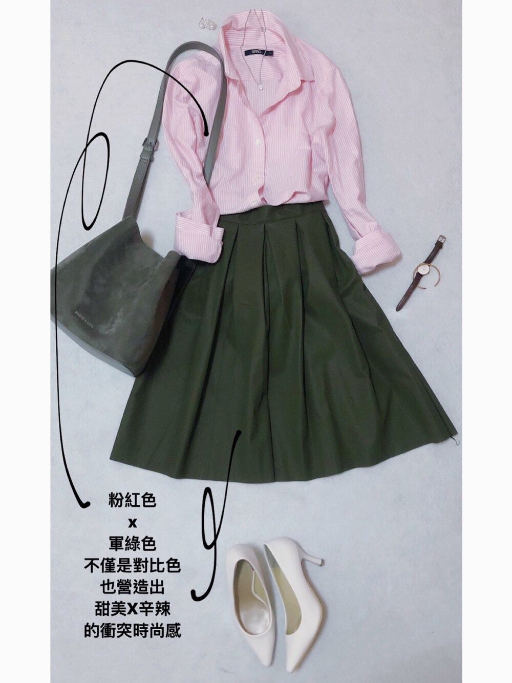 4月13日。23-32度。雷陣雨 昨天被大雨嚇到 決定今天穿仿皮革短裙當「雨裙」穿🤣 用粉紅色提振心情 畢竟已經是週五了呢! 每次穿上粉紅色上衣和腮紅相應之下 就會有人說我氣色很好😊 這件襯衫最近出場率很高 真的很實穿,推薦! 今日穿搭公式:粉紅色X軍綠色 其實這也是利用對比色的原理來抓住大腦的注意力 沒有正紅X正綠那麼的對比鮮明 各混入白與黑 因此而有既衝突又柔和的美感 我很喜歡 襯衫:SPAO 裙子:五分埔 高跟鞋:日本樂天AmiAmi 包包:新加坡小CK (Charles & Keith) #簡約時尚 #平價穿搭 #今天穿什麼 #每日穿搭小技巧