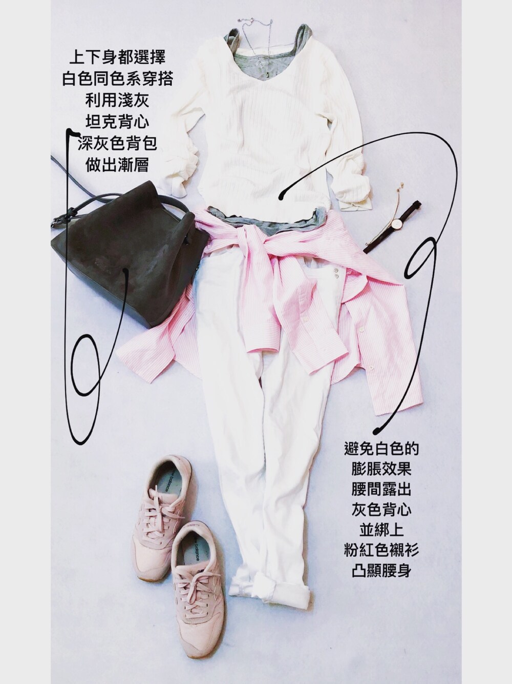 4月5日。21-28度。晴 全身同色系的穿搭 給人很清爽又有品味的時尚感 再利用淺灰色坦克背心和深灰色背背包 不僅做出另人舒適的漸層感 也成了白色和粉紅色的銜接色 / 為避免白色帶來的膨脹感 所以腰間露出灰色背心 並綁上淺粉紅色襯衫強調腰身 踩上粉色New balance 開心的出門吧! #簡約時尚 #平價穿搭 #今天穿什麼 #每日穿搭小技巧