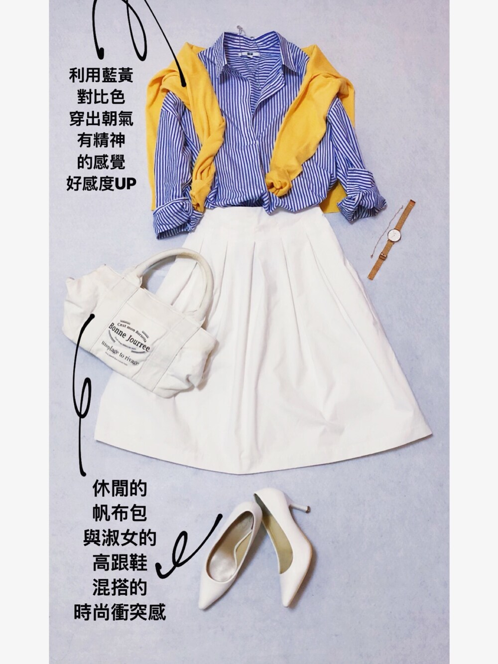 4月26日。21-28度。晴 等待已久的日文課終於開班了🎉 將將從小看nonnon雜誌時 就立下了希望未來有一天能看懂整本日文雜誌的志向(握拳) 雖然拖到現在,不過實現夢想永遠不嫌晚,妳說是不是呢?😊 等將將看懂了,也能即時為大家分享日本最新的穿搭風向喔! / 條紋襯衫是件很神奇的單品 有的時候給人渡假感,有時又給人上班OL的正式感,有時又有睡衣的感覺 超級衝突的🤣 也因此在選購時要注意材質、剪材和條紋粗細 條紋太粗就像睡衣 剪材太過合身就會太正式不好搭配 今天用藍色的對比色黃色的針織外套來做搭配 整體看起來就很有朝氣有精神☀️ 下半身是淑女的半身裙和高跟鞋˙ 所以提個帆布包製造點衝突感 / 襯衫:UNIQLO 珍織外套:台灣LuLu’s 裙子: UNIQLO 鞋子:日本樂天 AmiAmi 包包:日本MERCURYDUO