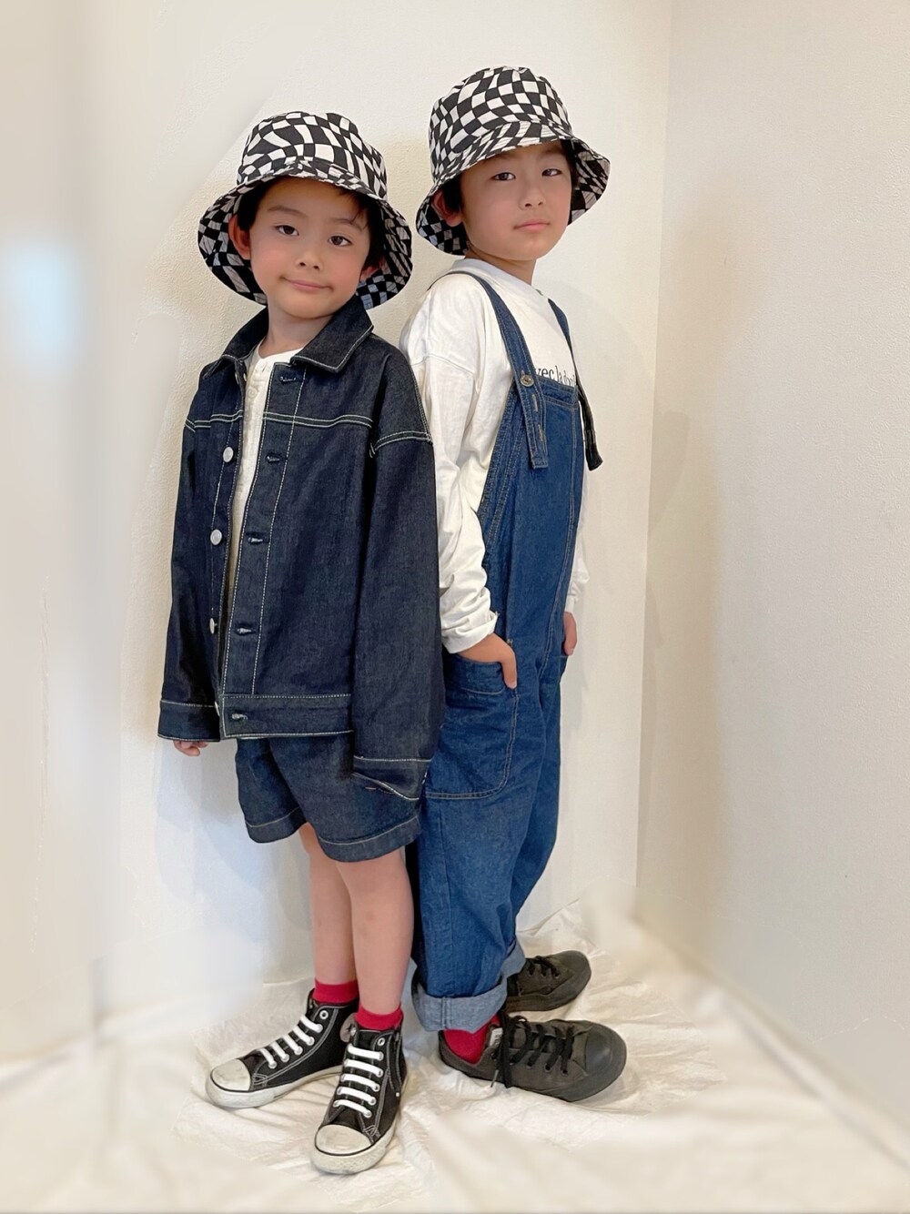 兄と弟です☺︎☺︎ 115cm 125cm いつもありがとうございます! お久しぶりのお2人ショット🐒🐒 チェック柄ハットとデニムで リンクコーデしてみました🏁 3枚目が1番バランスよく撮れたのに 弟の鼻の穴膨らませすぎーーー笑 基本変顔多めの兄弟です🙈