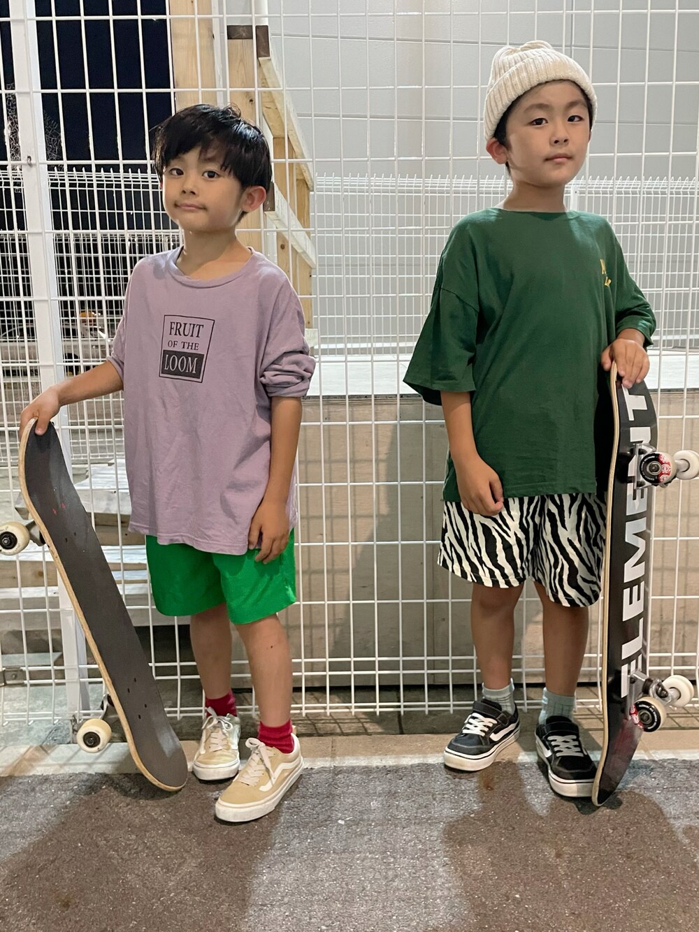 兄と弟です☺︎☺︎ 125cm 115cm ♡、お気に入り、📁、フォロー どれもとても嬉しいです! いつもありがとうございます。 弟は前回のコーデでスケボー行ってからの汗だくになりトップス着替えました🙈 色色色色んな色ですねコーデ🤣 お派手兄弟でした🐒🐒