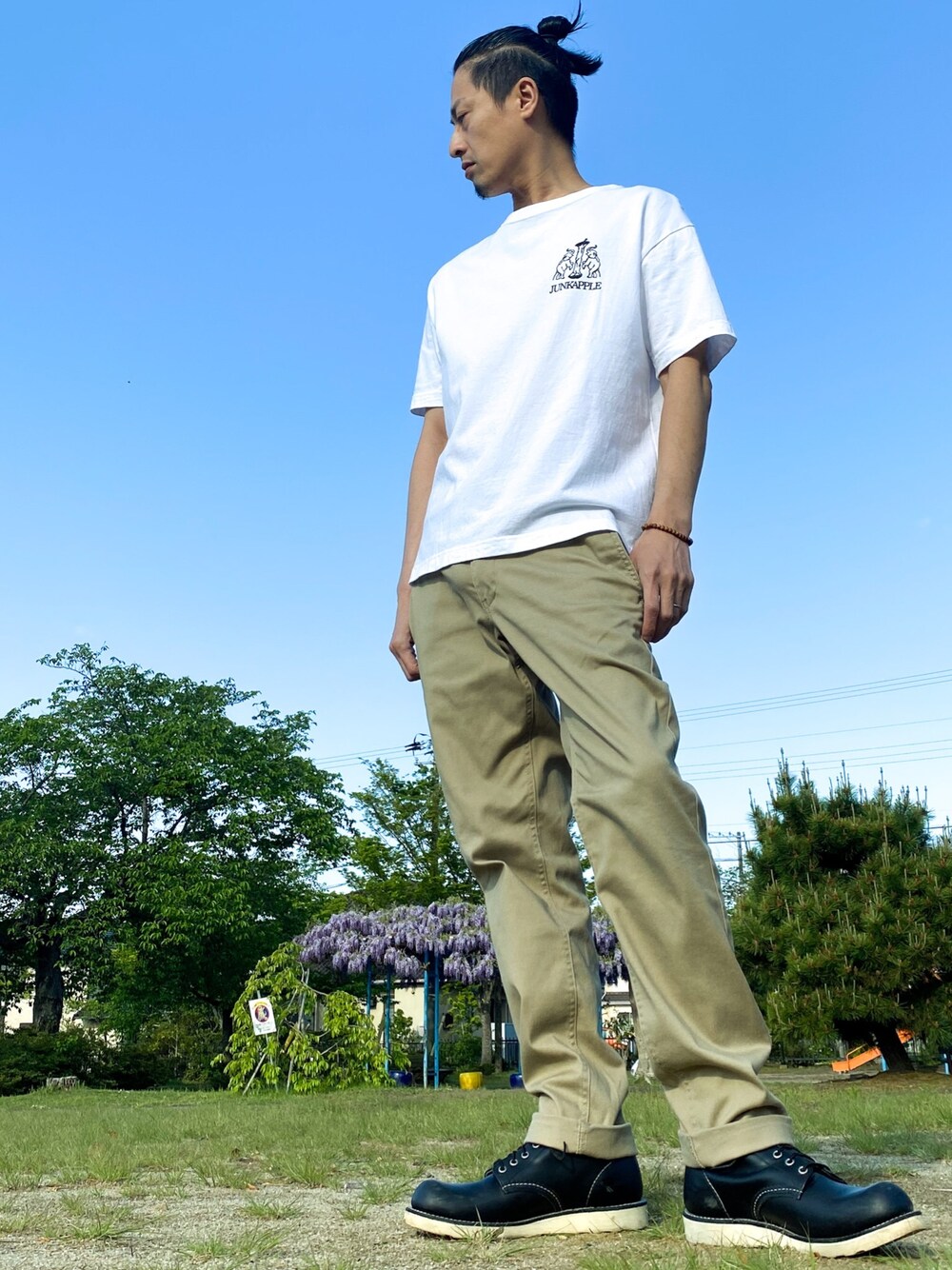 JUNKAPPLEのチノパンツ「【SPADE】Dickies ストレッチスリムチノパンツ」を使ったコーディネート