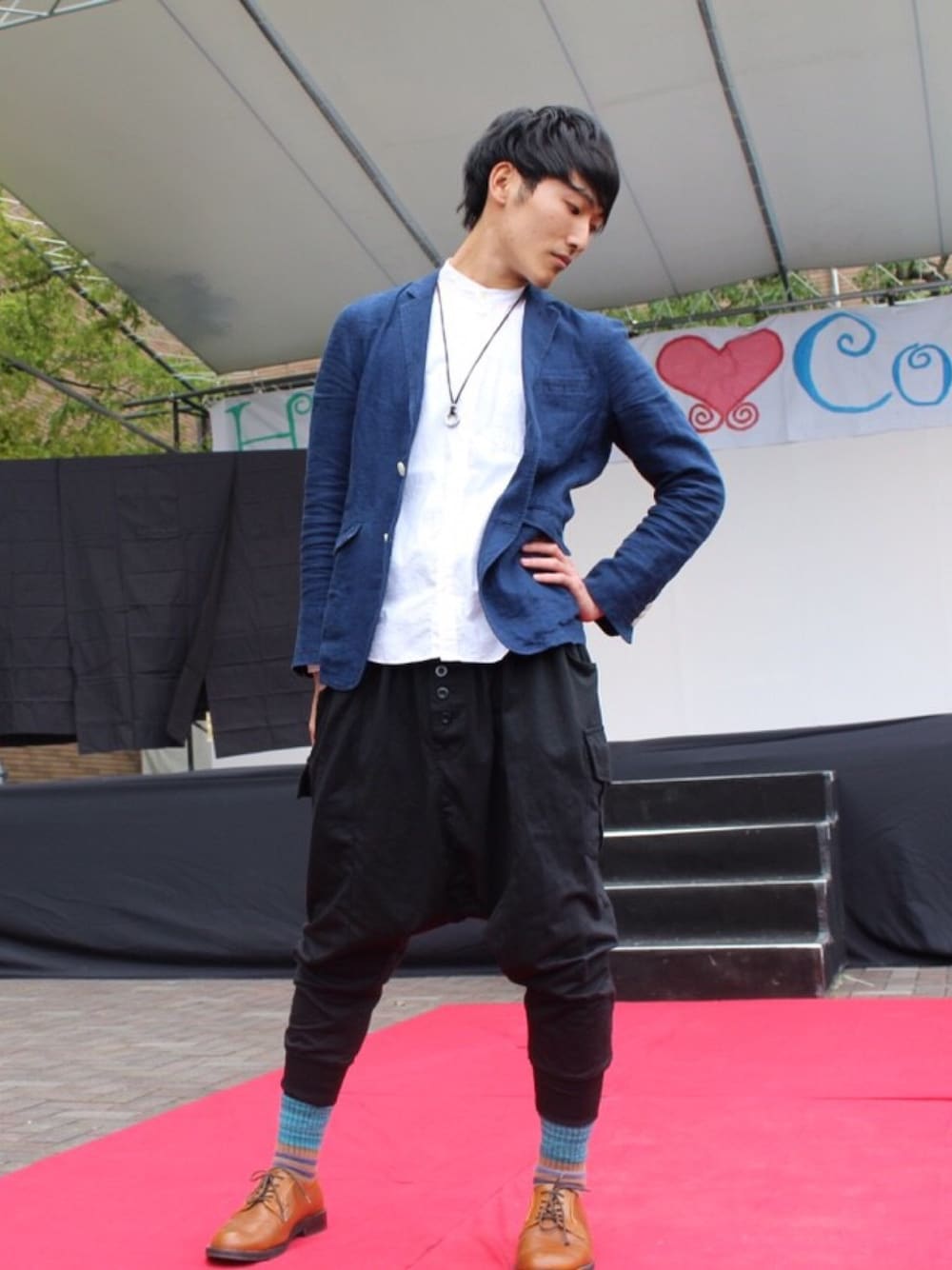 ファッションショーの時のコーデです! サルエルパンツをはき、バランスを取るために上はノーカラーの白シャツにジャケットできれいめにしました!