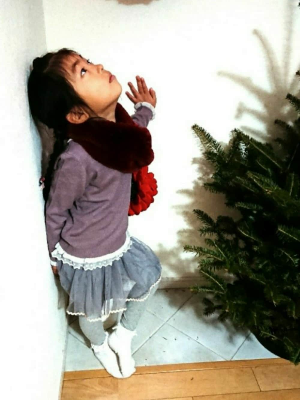 シンプルだけどちょっとしたディテールがガーリーなもの、のコーデ😃✨ キャサリンコテージのニット、目がつまった上品な編地が、きちんとした印象を醸してくれます🤣。裾と袖口がさりげなく配色フリル、という点もお気に入り! チュールスカート付きレギンスと合わせて。 またまた何やら上を気にしている次女ですが、そのうち手を振ってみたりして😅。決して見えてはいけないものが見えているわけではなく、ここ数日間、家の改修工事をしているため、屋根の上を職人さんが歩いてたりしてます(笑)。いつも写真をとってるこの場所はちょうど上が天窓になっているので、たまに人影が見えるのです😂。