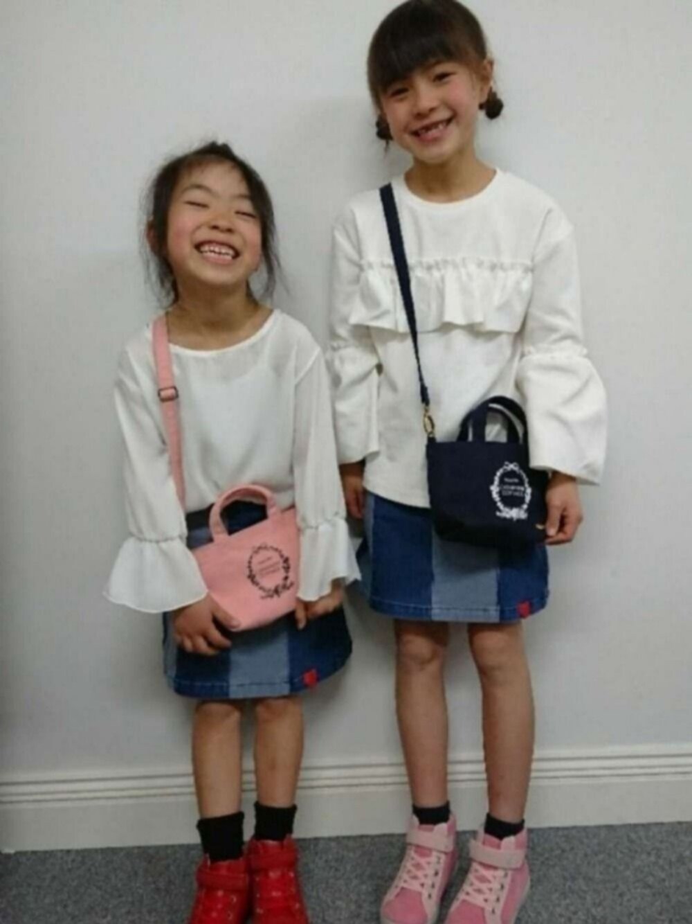 白フリルトップスに、パッチワークデニムスカートで仲良しコーデ♪ ZOZOTOWN限定販売ミニショルダーと、近々発売のスニーカーを色違いのおそろいで😆。 キャサリンスタイリストさんのお嬢さんとのコラボパート2‼️ 小さい方が我が子、春風にひらひらなびく軽やかジョーゼットトップス、スタイリストさんお嬢さんはプレミアムリブのフリルトップス♪ このままお花見にでも行けそうな! キレイ色がおしゃれなミニショルダーは、大人っぽいシンプルデザインがかわいく、ハンカチ、ティッシュ、子ども携帯、飴数粒(!!)くらいは入る大きさ、子どもが持つとかわいく、もちろん大人の方もお持ちいただけます。 近日中に発売になると思われる、新製法のスニーカーも大注目です!!