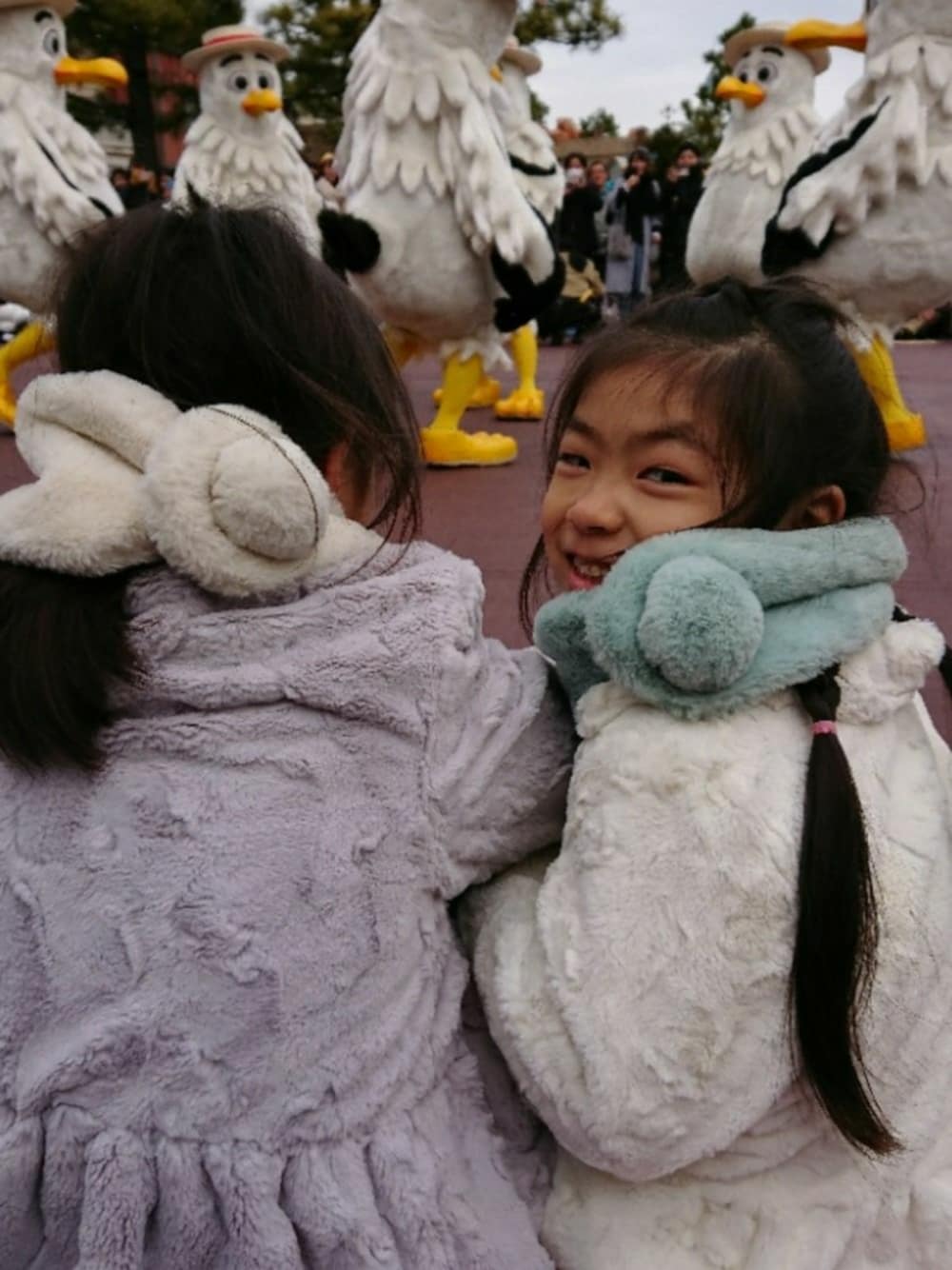 暖かくなってきたと思ったら、また寒い💦 この冬たくさん着たキャサリンのフェイクファーコートがまだまだ手放せない💦 うさぎのしっぽマフラーも! ディズニーランドのアナ雪パレードも3月19日まで。あと一週間ちょいと。 アナやエルサのフロートじゃなくて、我が家はこの鳥(カモメ)ポジションが鉄板😁。無表情でLet it goにあわせてゆらゆらするとこなんて、ほんとシュールすぎてツボっ! このエリアは毎回くすくす笑いがおきてあたたかい空気になります(笑)。 最後鳥がきて子供たちと握手してくれたんだけど、思わず姉、「やっばーぃ、めっちゃ人の手だった‼️」ってウケてた🤣