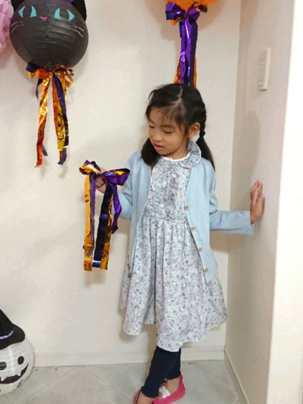 キャサリンコテージのオリジナル小花柄が清楚かわいいワンピースに、リブカーディガン、リブレギンスを合わせたコーデ。 朝は肌寒いけど、学校は暑いらしく💦、ノースリーブワンピースにカーディガンぐらいが暑がりガール、略して「暑ガール」にはちょうどいいらしぃです。(←その説明いったか?🤔) 116cmですべて120着用。 我が家のこのフォトスペースもハロウィン仕様になりました🎃 ネコやカボチャ(見切れてる😱💦)、おばけちゃんの装飾はすべてDAISO。そこに、ランドの35周年サプライズ演出でワールドバザールに降ってくるキラキラをリボンにリメイクしたものをトッピングしてみましたよ➰🙃。ハロウィンイベント中はキラキラもハロウィンカラー! オレンジ、ゴールド、パープル、ネイビー、このカラーリングがとてもシックで気に入って、なんとか活用できないものかと。他には髪飾りも作ってみました♪。