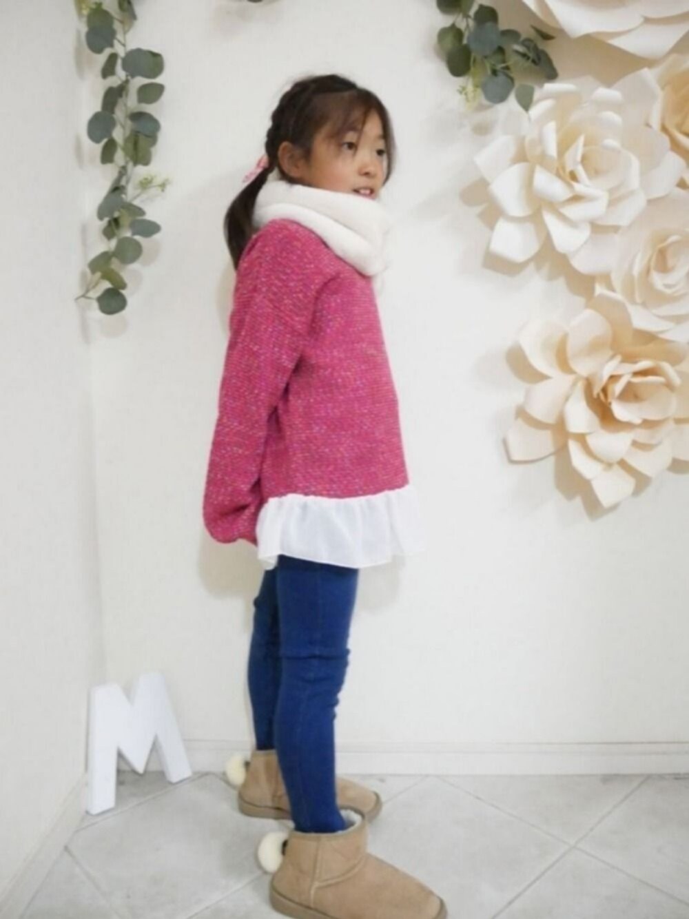 オーバーサイズトップスに、のびのび楽々なストレッチパンツはデニムカラーで、そしてうさぎのしっぽマフラーを合わせたコーデは、実はキャサリンコテージのコーディネイトセット✨ ストレッチパンツは裏起毛であったかだし、どのアイテムも他と合わせて楽しめる、コーデの幅も広がるセットですょ🙌✨ 足元にはこれまた、うぎのしっぽがついたボアブーツ🐇